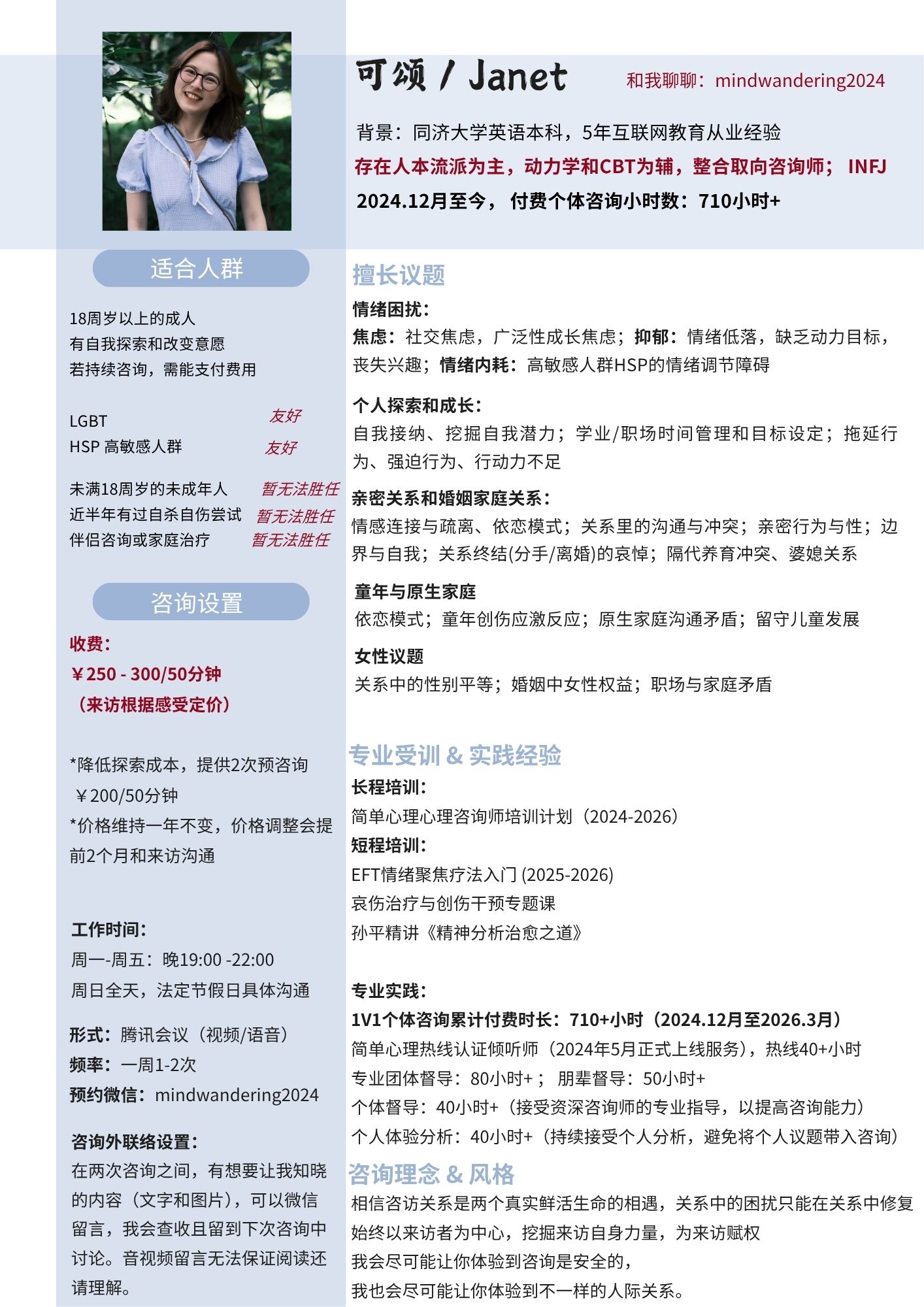 目前累计咨询小时数710+小时。2026年招募3-4名新来访,如果你想要找个人聊聊,可以添加工作微信【mindwandering2024】,请备注“心理咨询”。