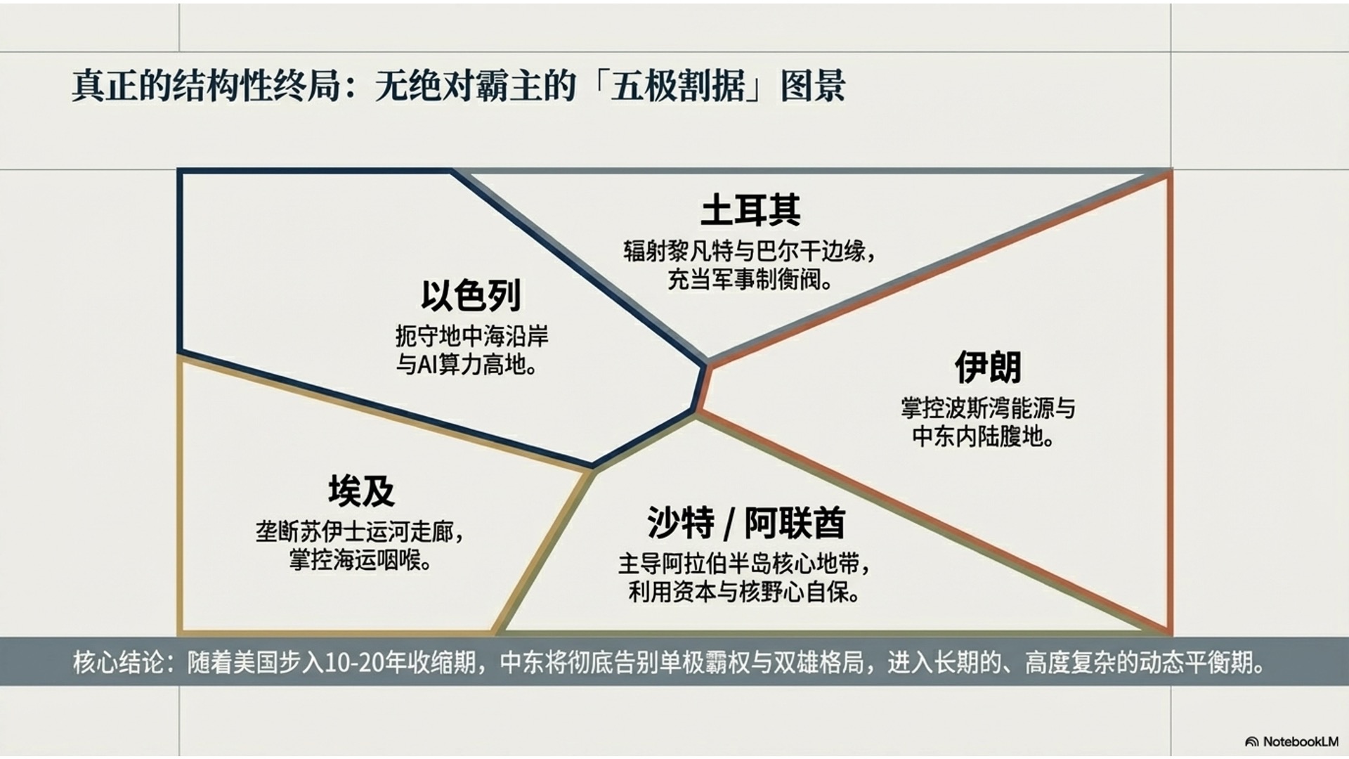 节目最终推演指出,随着美国步入为期十余年的“管理式撤退”,未来的中东并不会是简单的双雄并立,土耳其、埃及、沙特等地区强国将迅速反弹填补权力真空。整个地区将彻底告别单极霸权,步入一个无视传统国际法约束的“丛林法则”时代,最终形成受资本和技术驱动、五强割据且长期动荡的碎片化多极新秩序。
