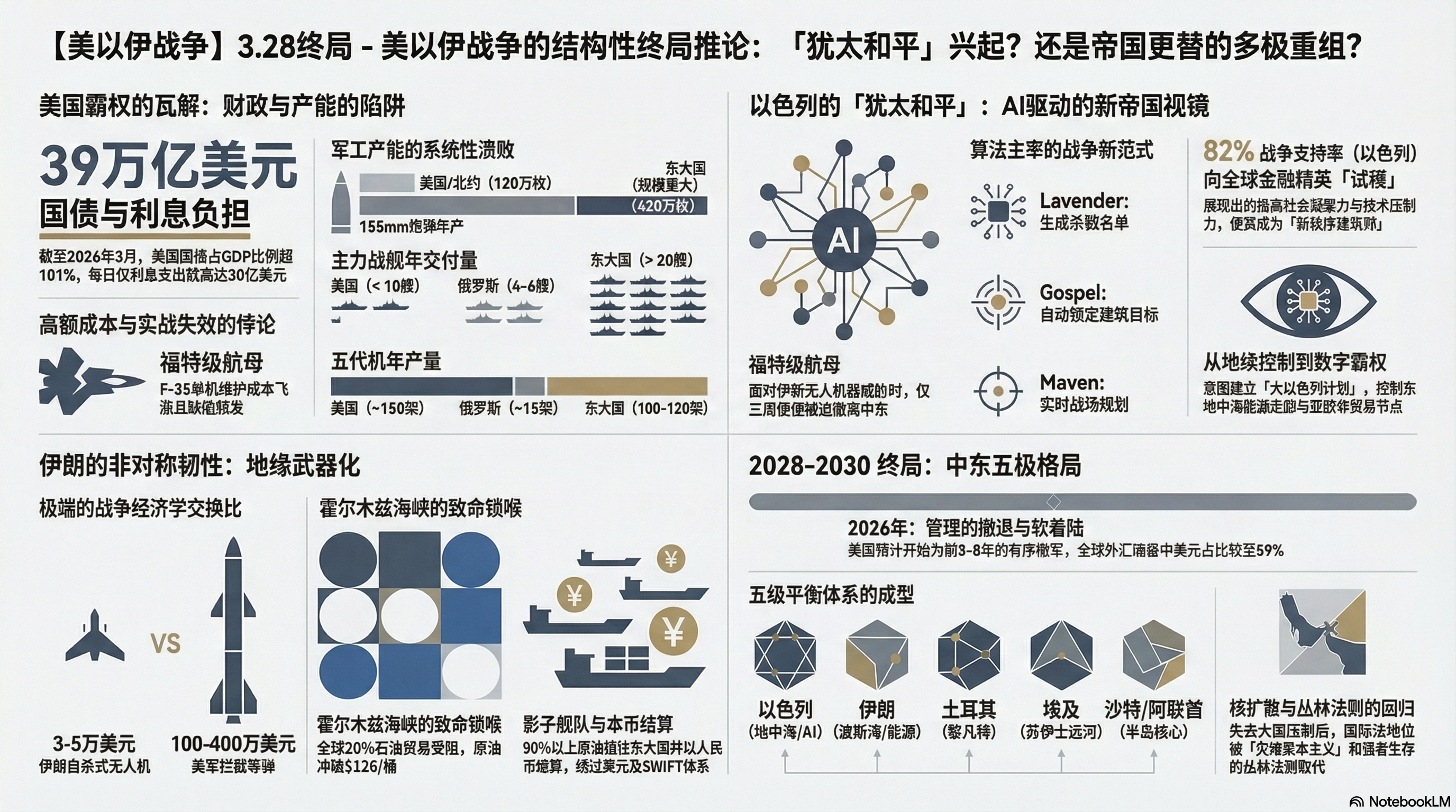 与此同时,战局催生了两大核心玩家的战略进阶:以色列利用Lavender和Gospel等极度冷酷高效的AI战争系统,向全球金融精英进行“试镜”,试图垄断区域贸易走廊并建立数字算力帝国;伊朗则通过封锁霍尔木兹海峡实现“地缘武器化”,并依靠“影子舰队”和人民币结算深度嵌入中俄主导的欧亚经济网络,尽管其内部正面临严重的经济与权力世袭危机。