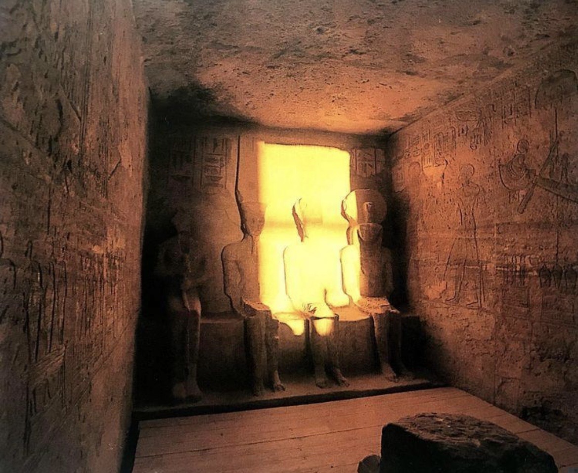 圣所内四尊神像的太阳节奇观,从左到右依次为:冥神普塔赫、阿蒙-拉、拉美西斯二世神化像、拉-哈拉赫提