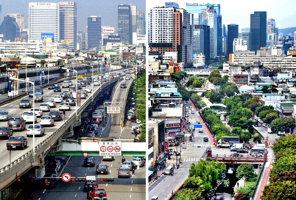 清溪川复原前后对比,从高架桥到生态走廊 ,来源:原网页