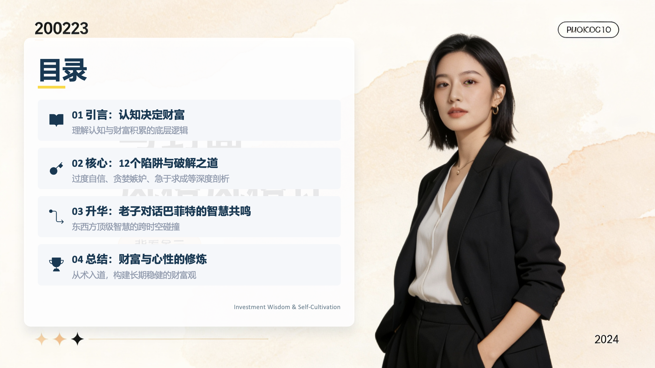 大家好,今天我将为大家解读一本非常有价值的投资书籍——《财富是认知的变现》。这本书的核心观点是,我们最终的财富积累,实际上是我们认知水平的外在体现。在投资的道路上,我们常常会因为各种认知陷阱而犯错,导致财富的流失。本次分享将深入探讨书中提到的12个常见认知陷阱,并学习对应的破解之道,希望能帮助大家建立更成熟的投资认知体系。