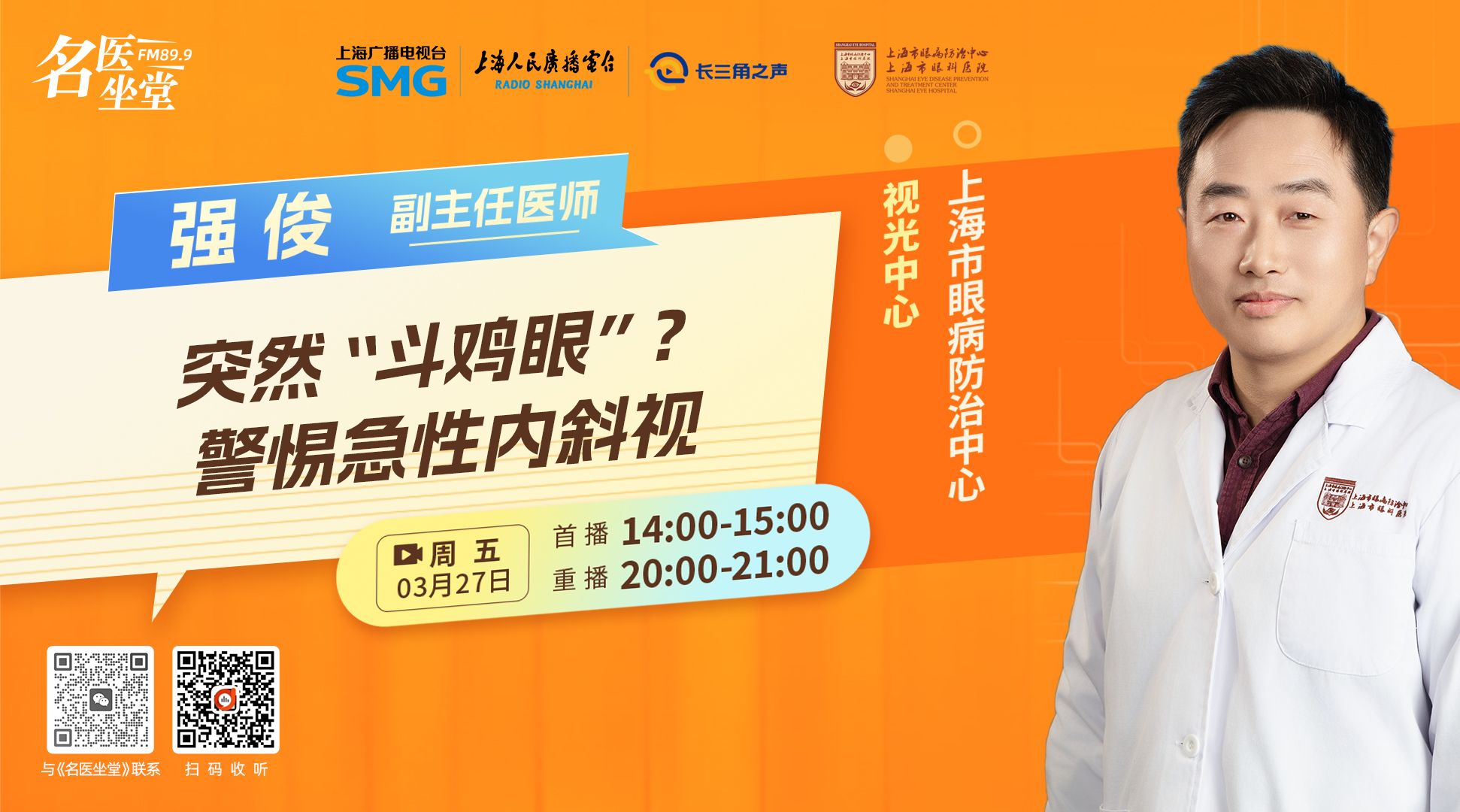 本次健康科普节目围绕成年人急性内斜视、儿童间歇性外斜视等各类斜视问题,邀请上海市眼病防治中心强俊副主任医师讲解病因、危害、自测、诊疗方案,并解答听众关于儿童麦粒肿转霰粒肿的咨询。