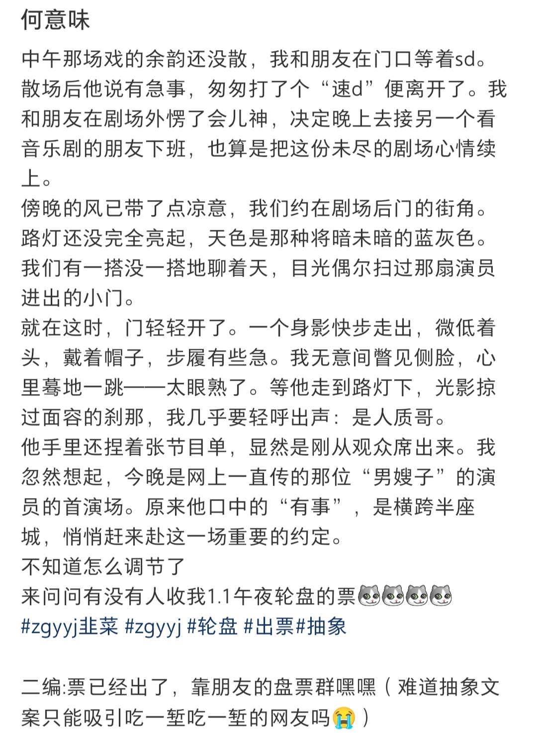 相信大家看到五花八门的剧在最近的时间、地点开票,都会有意志薄弱的时刻,在盘票群蹲自己的心选票,甚至反复盘自己的看剧规划表,盘票作为一门“以物换物的特殊学问”,更是有时候让剧女老师们感慨:会盘票,做什么都会成功的!这期我们请到了盘票老手——饺子老师和我们一起聊聊盘票那些事儿!