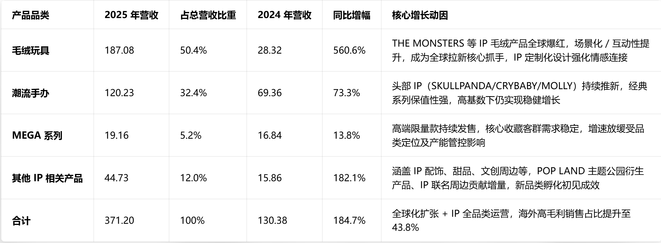 泡泡玛特 2025 年 vs 2024 年各品类营收拆解