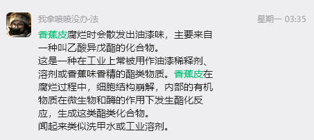 ● 激情复盘小法凌晨三点在群里科普“香蕉皮腐烂为什么会散发油漆味”,以及研究海豹、海狮区别的事迹。