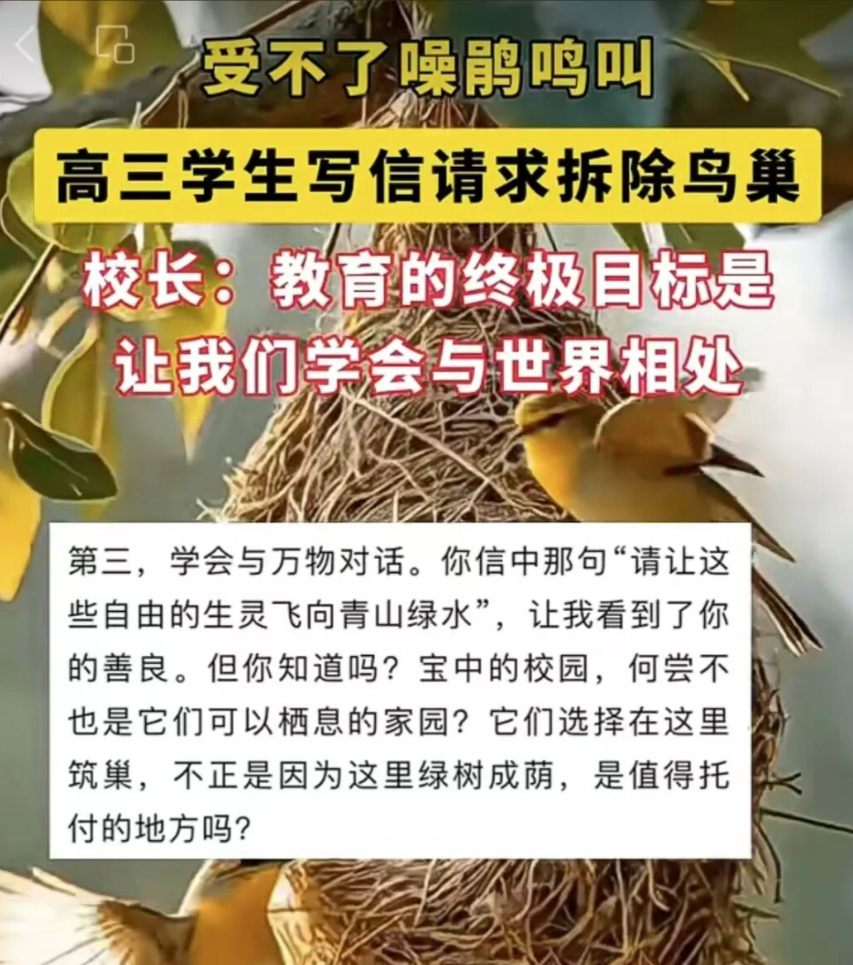 高三学生备考因鸟叫声太大求“拆鸟巢”,校长不批评敷衍!千字回信:学会与世界相处