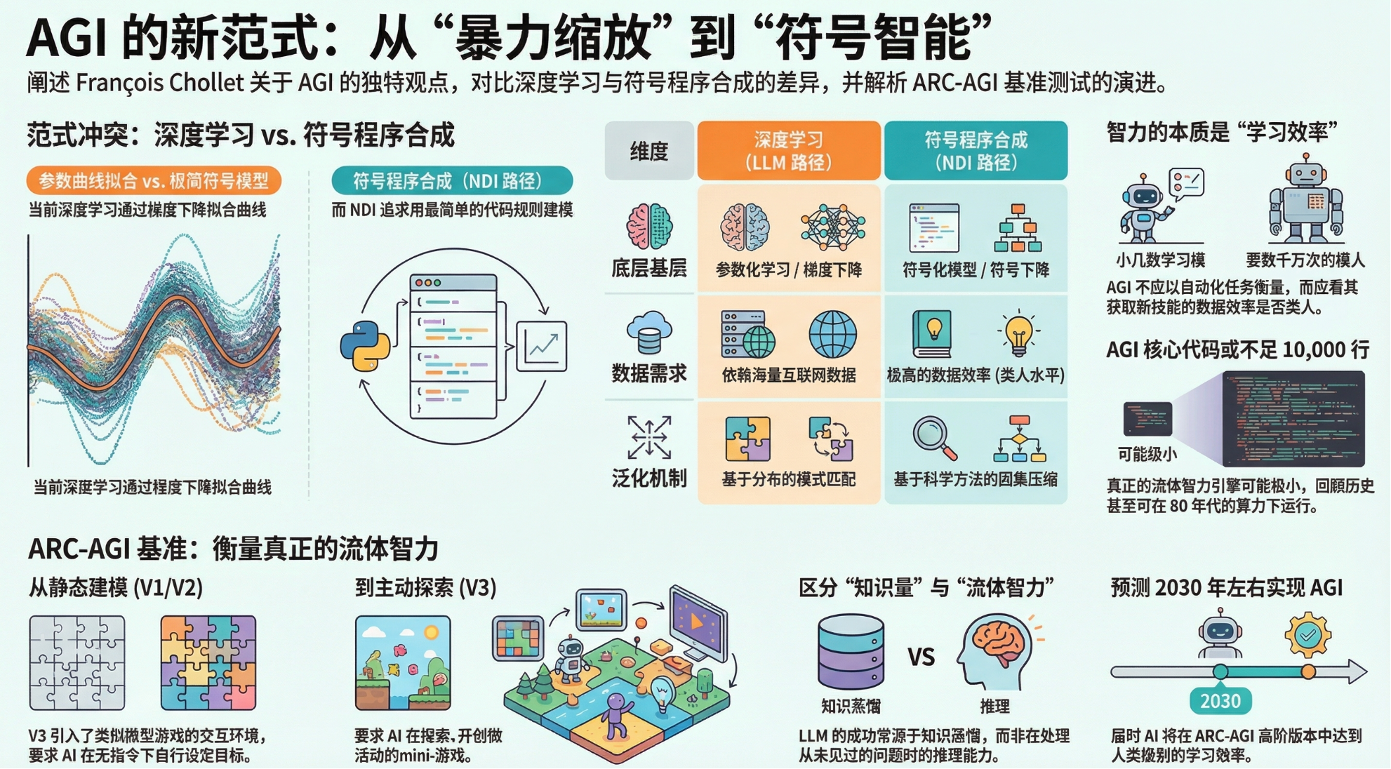 * 01:31 程序综合新路径:François Chollet介绍了他的新实验室Indie,它致力于研究“程序综合”这一全新范式。他强调,这并非简单的代码生成,而是旨在建立“一个深度学习本身的替代方案”。通过寻找能以最少信息量解释数据的符号模型,该方法有望在数据效率、推理效率和泛化能力上远超现有技术。