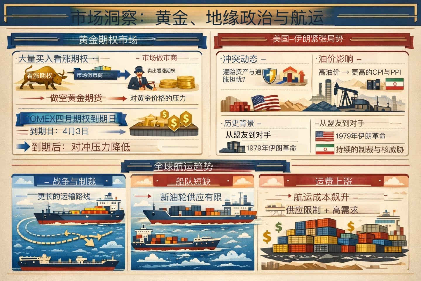 为什么金价本周走势与美股美元背道而驰?期权做市商在到期日如何通过对冲压力“收割”波动? 本期节目,小东与小腾深度拆解黄金期权的隐秘定价逻辑,并跨越半个世纪,复盘美伊关系的四次转折。从海运业的运距拉长到全球资产的通胀定价,带你构建一套应对地缘冲突的分析框架。
