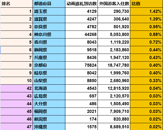 2.各都道府县的anitabi到访点击数与外国游客住宿的数据分析