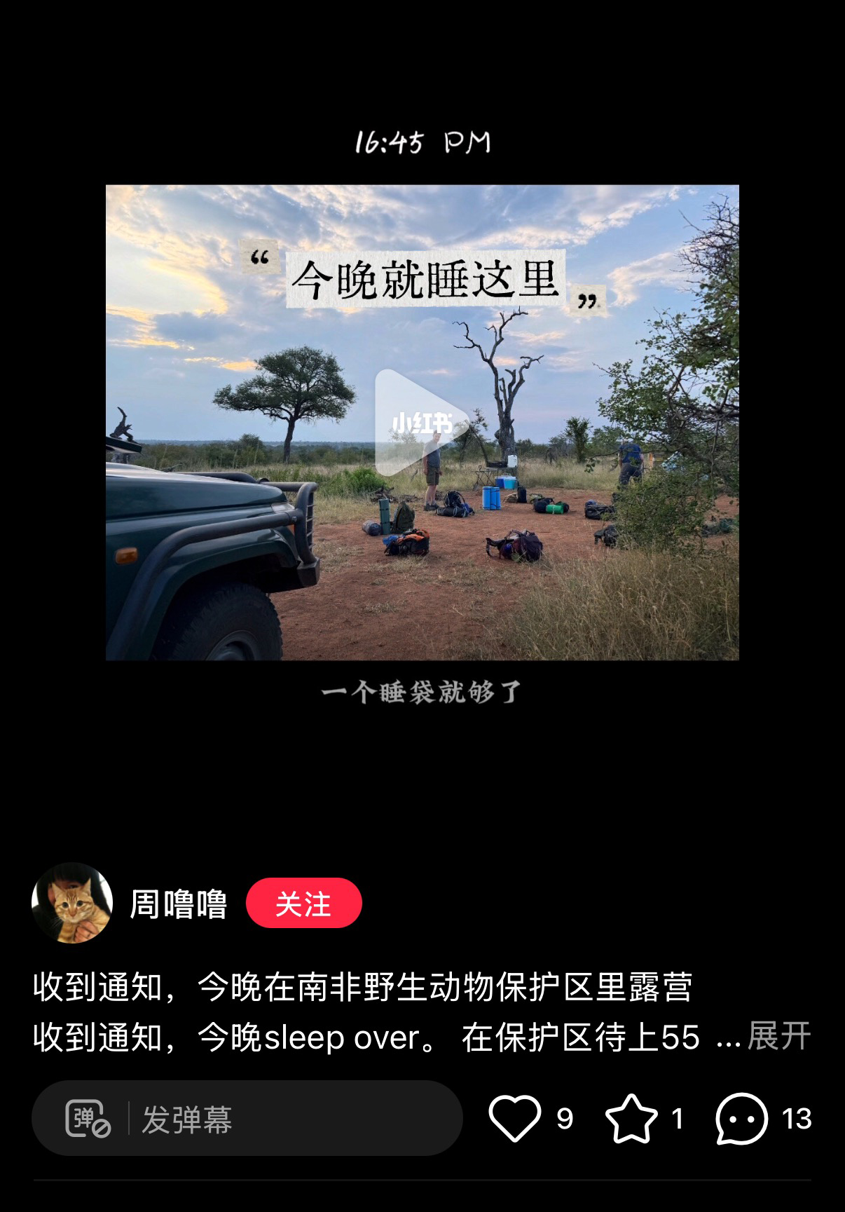 如果对节目里提到的在南非的野生动物保护区里扎营,可以在我的XHS里看到: