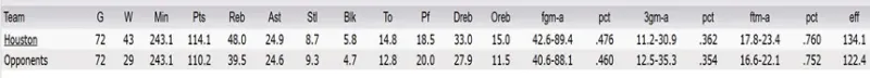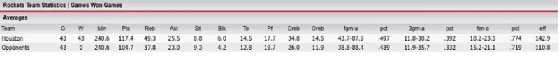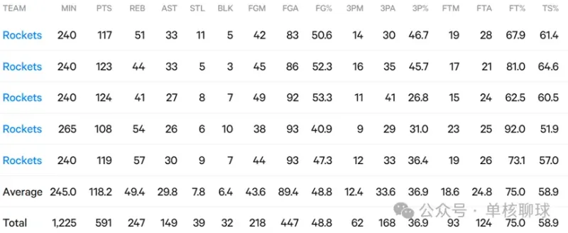 那么我们就来看看,过去一周5场比赛,火箭在变阵后究竟发生了何种改变?过去5场,火箭3胜2负,场均得分118.2分,2分命中率48.8%,三分命中率36.9%,篮板49.4个,前场篮板14.2个。