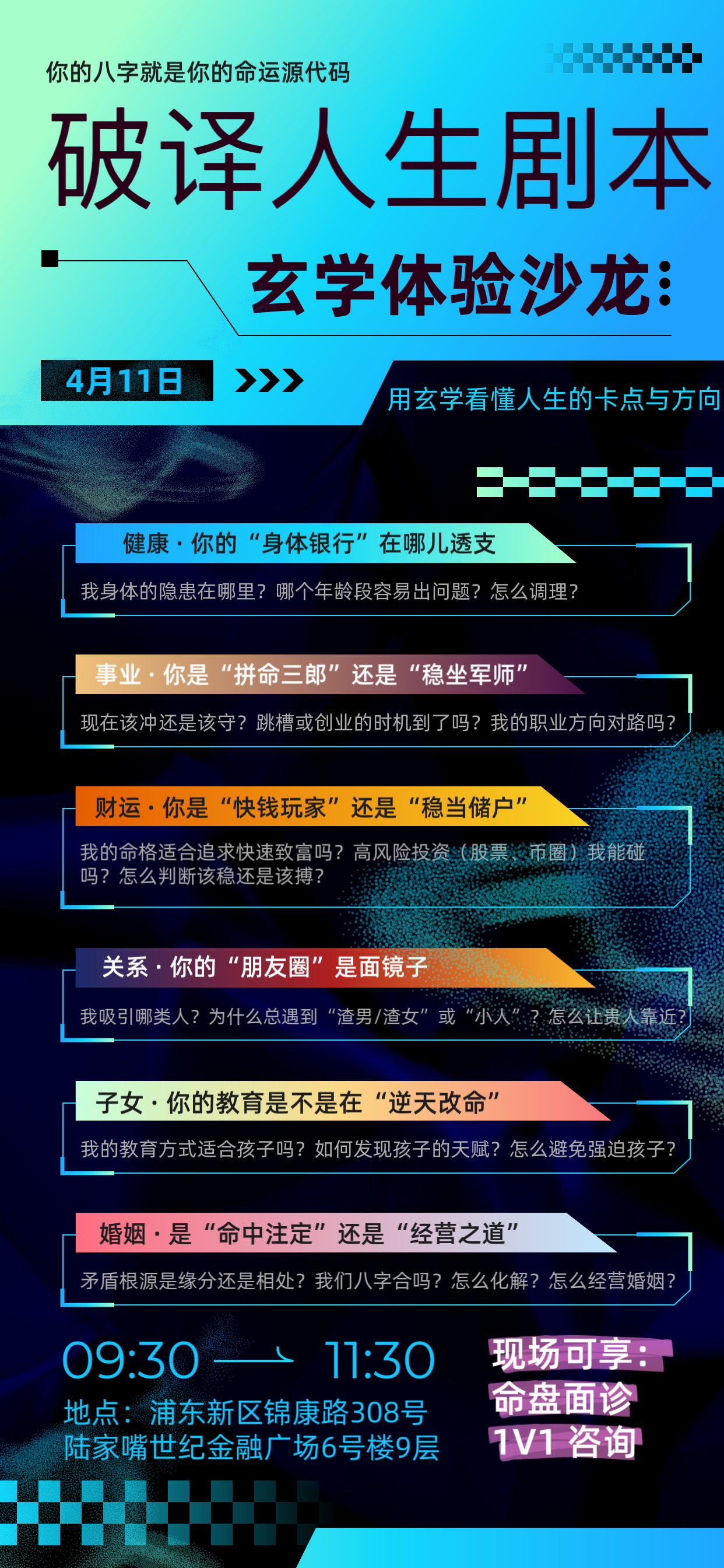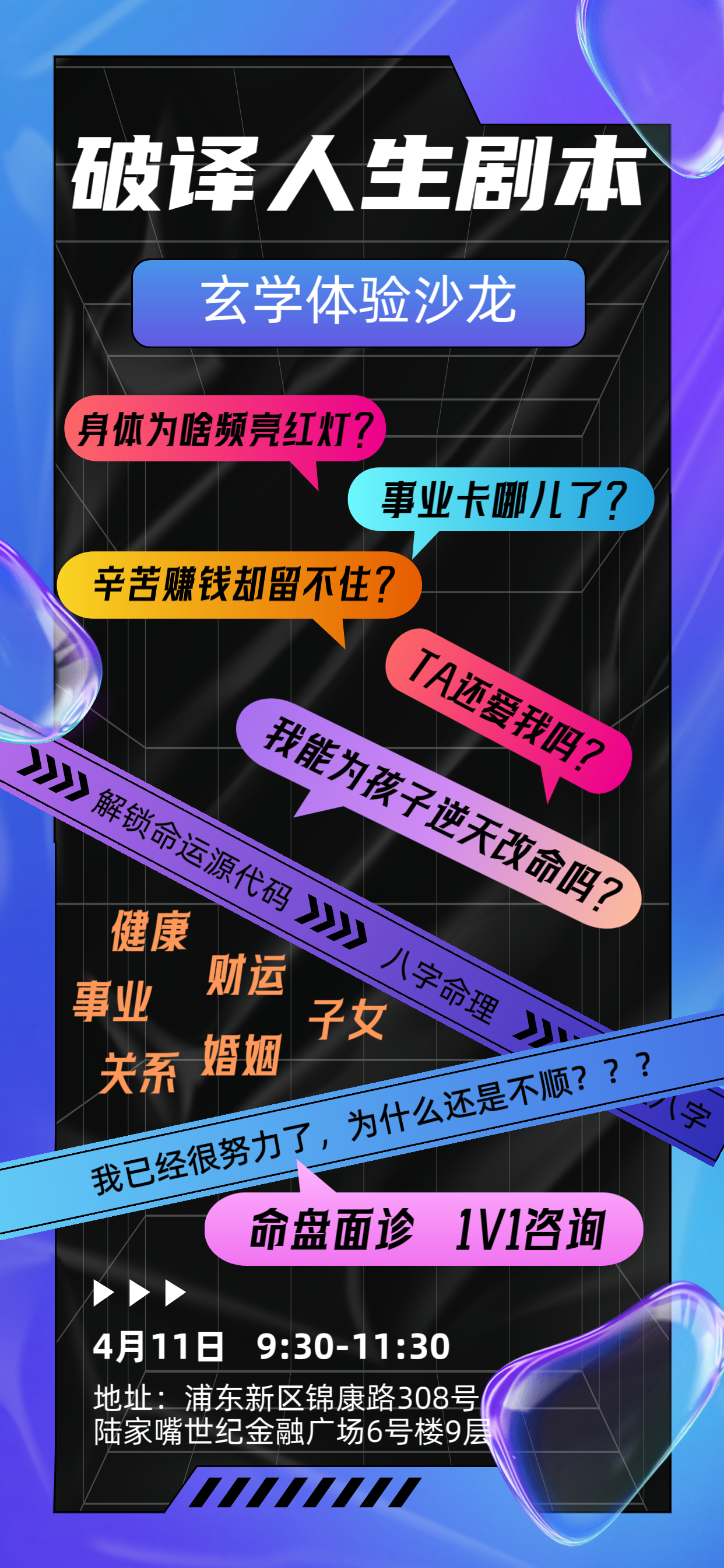 4月11日,其乐容容在上海浦东新区举办线下沙龙,邀请人气嘉宾金老师,分享日常生活中用得上的玄学知识,还有更多八字玄学体验,加主播VX(qlrr0529),预约报名!