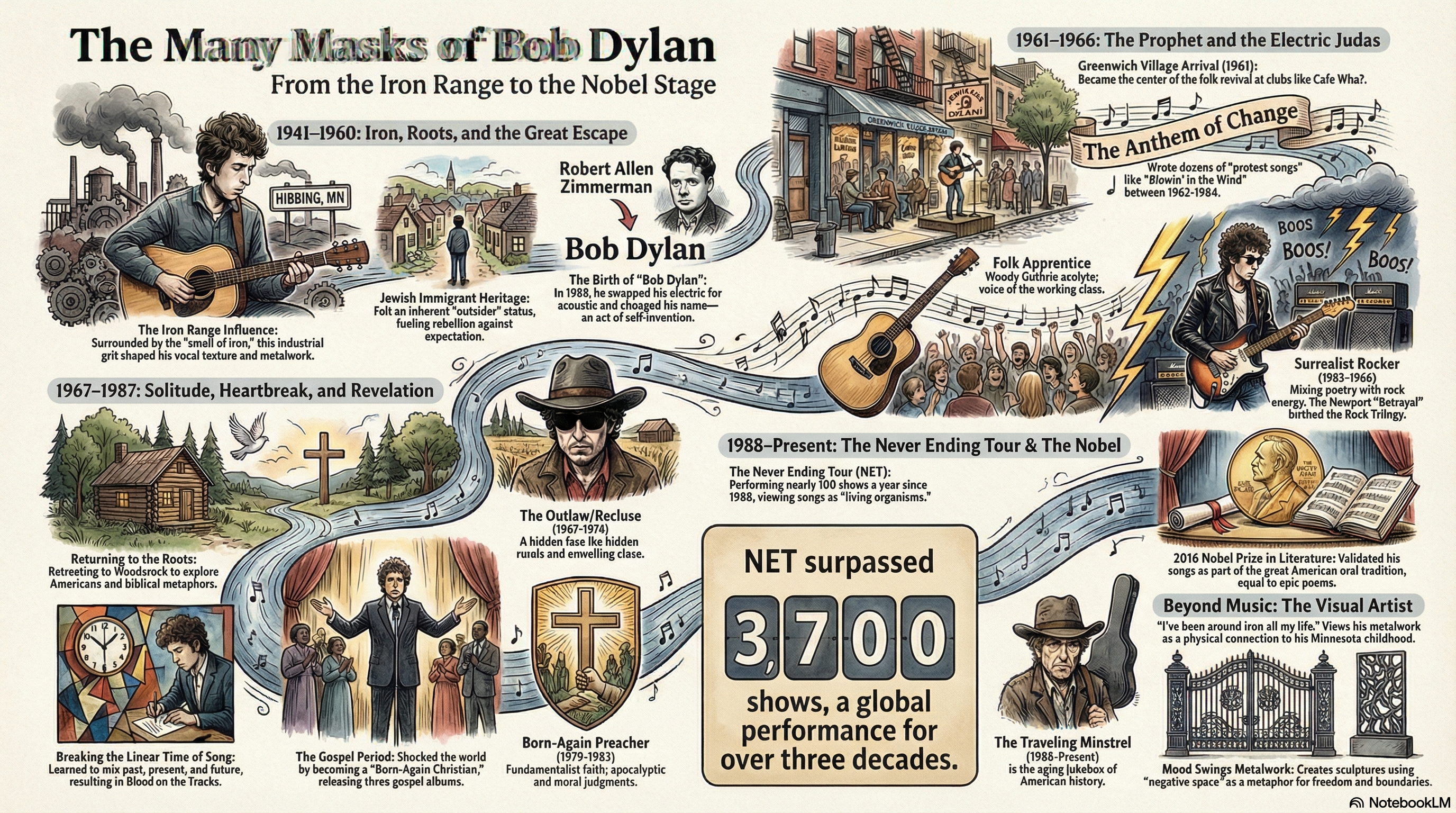 这里详尽地回顾了鲍勃·迪伦从明尼苏达矿区少年成长为诺贝尔文学奖得主的传奇历程。文中深入探讨了他复杂的身份重塑,包括从犹太裔背景到民谣先锋、再到摇滚叛逆者的多次转型。通过分析其经典的音乐专辑与铁艺创作,资料揭示了迪伦如何将传统民俗、存在主义哲学与现代诗学完美融合。此外,报告还阐述了他在“永不落幕的巡演”中展现的艺术生命力,以及他如何打破文学边界,确立了其在全球文化史上的核心地位。总之,这些文献不仅记录了一位音乐巨匠的生平,更是一部关于美国精神与艺术进化的深度研究。