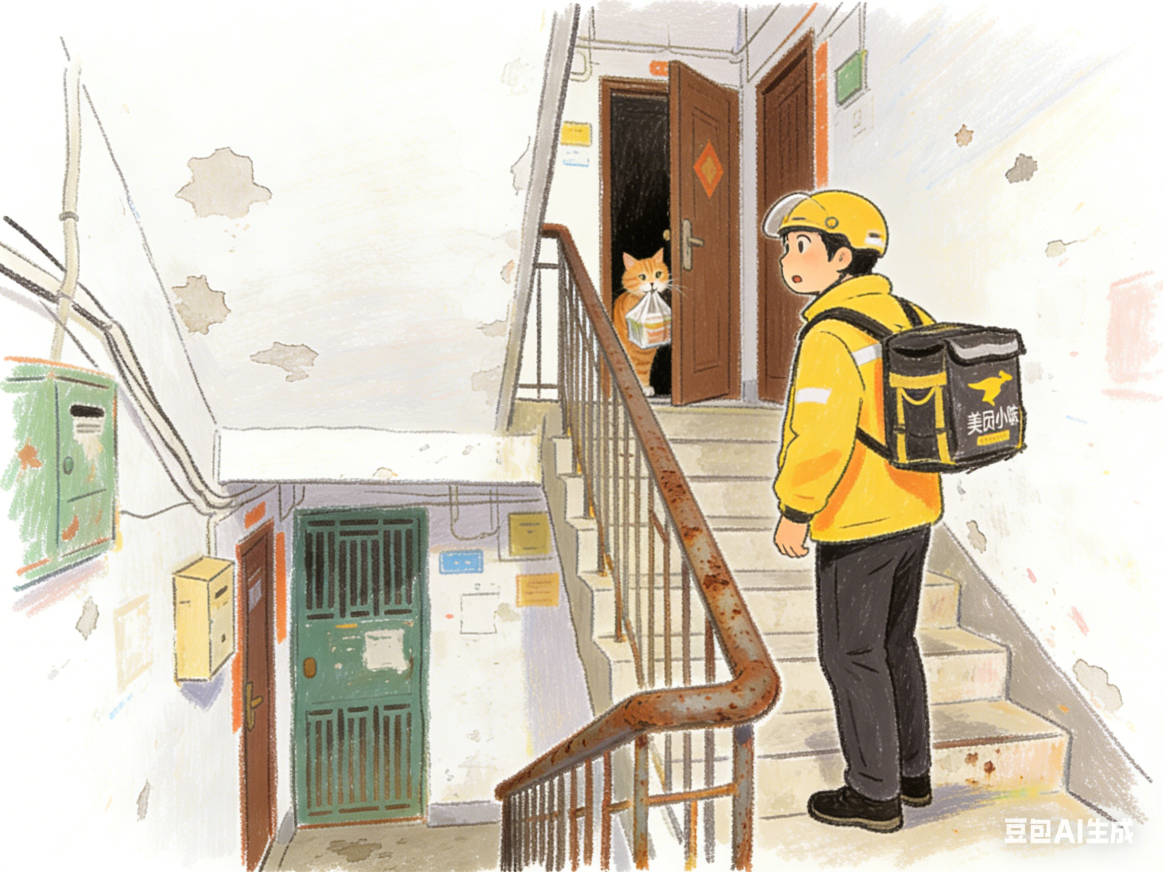 第二天,他照常送。放门口,拍照,转身。但这次他没有立刻走,他站在楼梯拐角,等了一会儿。门开了,猫出来了,叼起外卖,回去了。