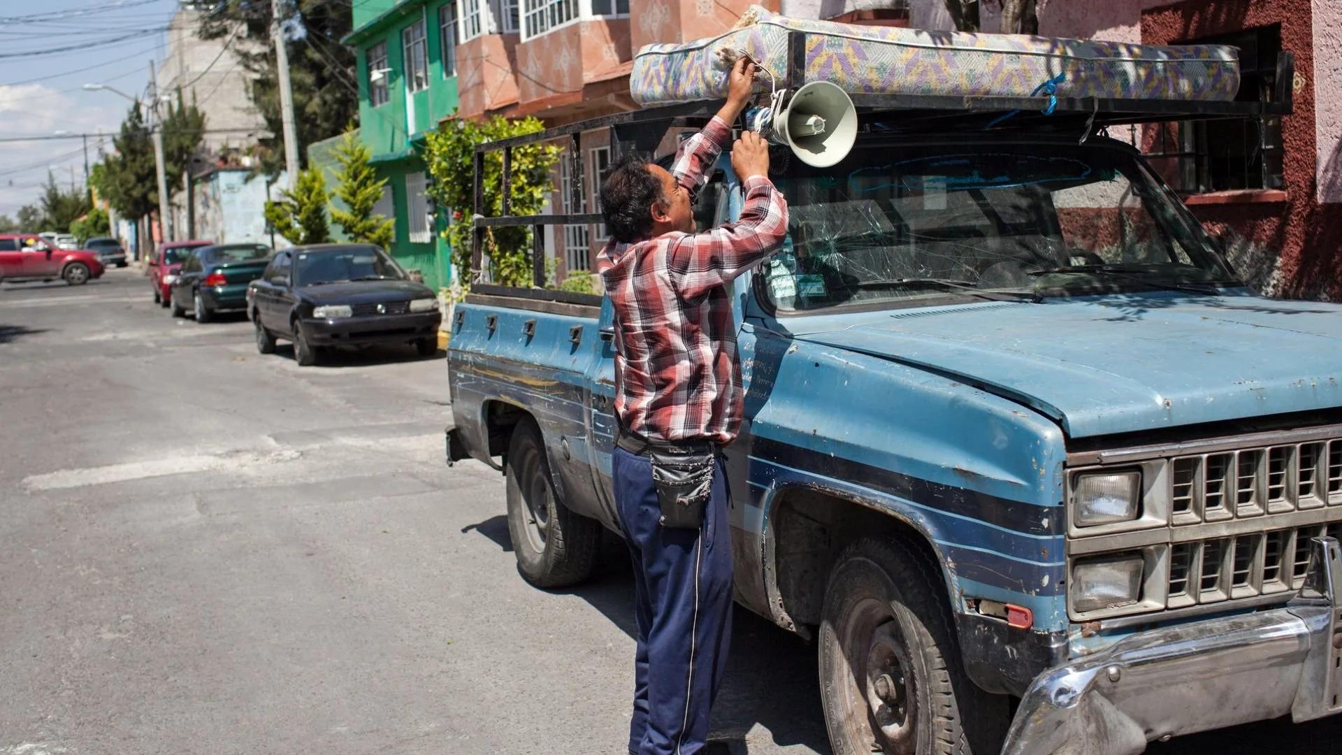 54:35 墨西哥城收旧货车放着统一的叫卖声