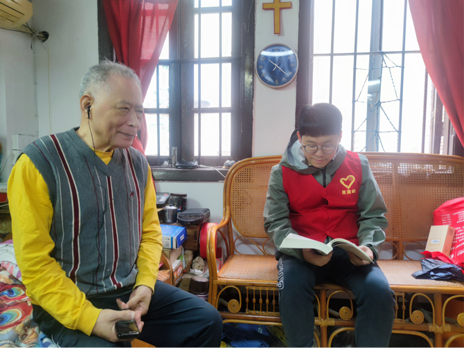 △中山图书馆工作人员上门给视障老人阅读