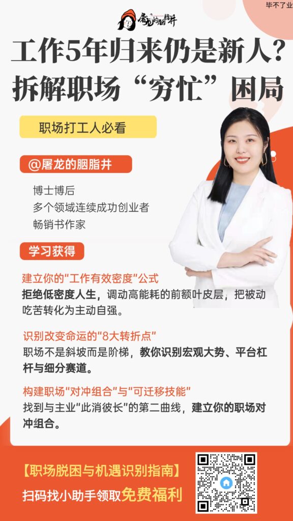 很多人每天耗在工作上11-14小时,但主动有效工作趋近于0。主动有效不是盲目学英语、刷课程,而是主动去做真正有效能的事——主动对接真正有用的人脉、请教领导、学行业报告、用AI工具提效,每天2件,工作密度就能达到15%+,长期下来会有惊人复利。
