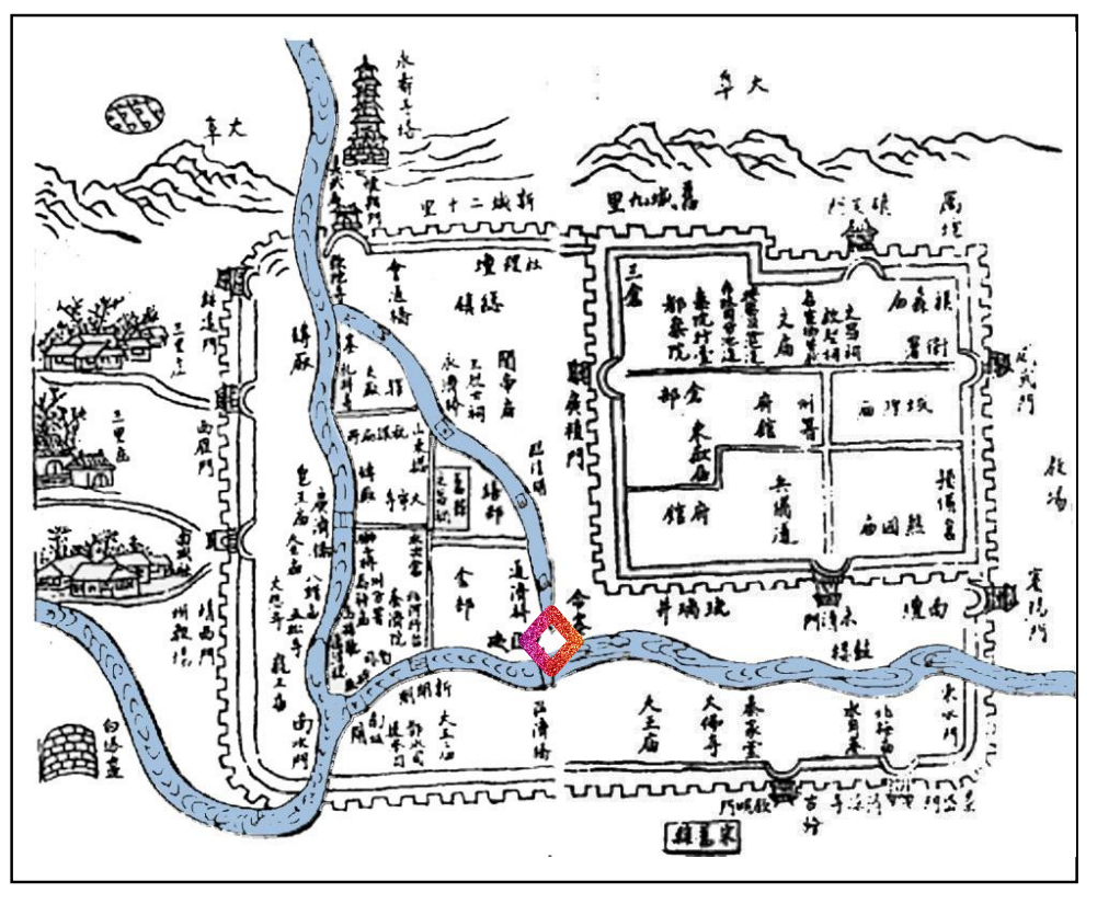 △ 临清州城图,颜色标注为鳌头矶,三角区为中州古城