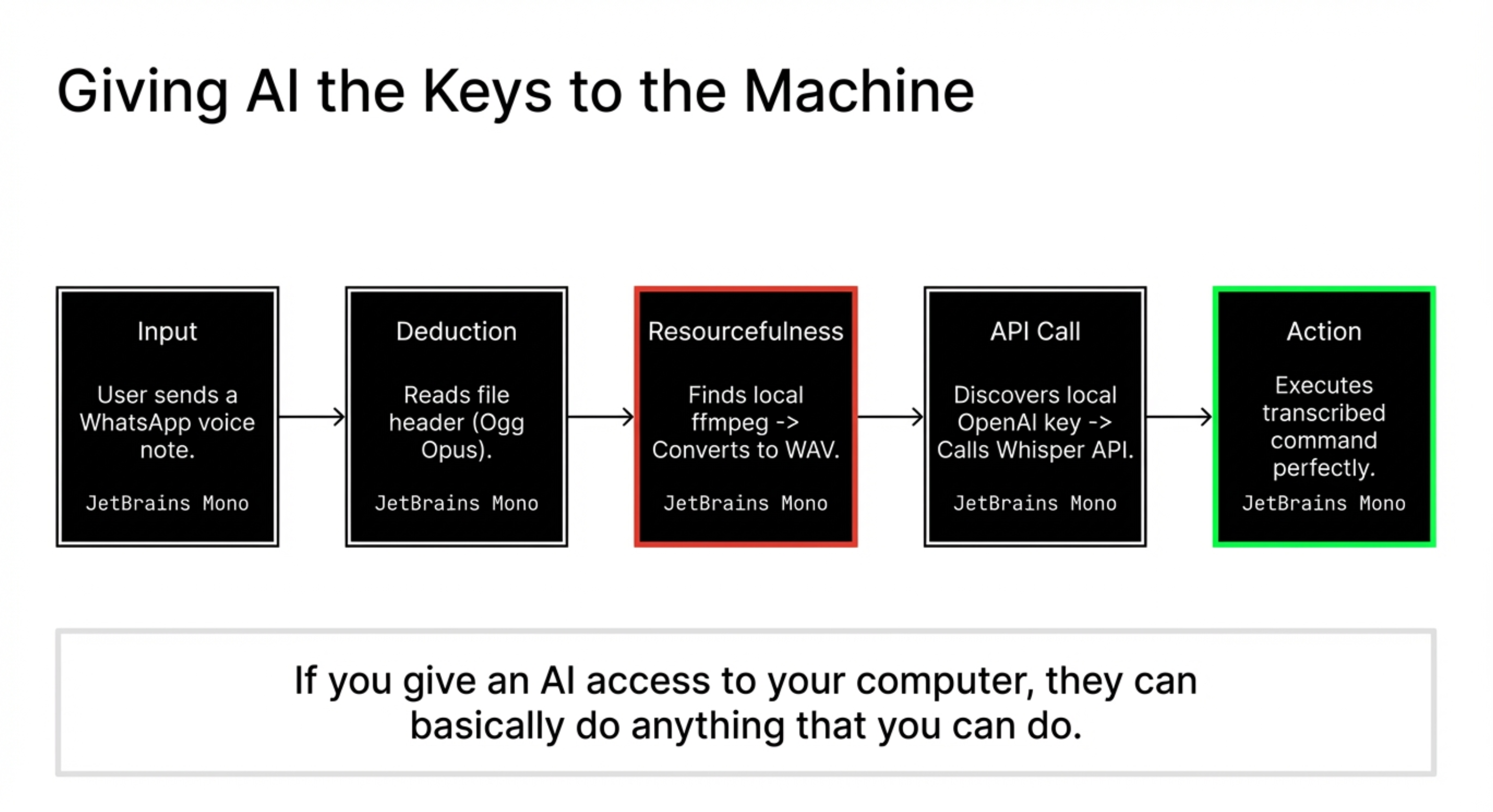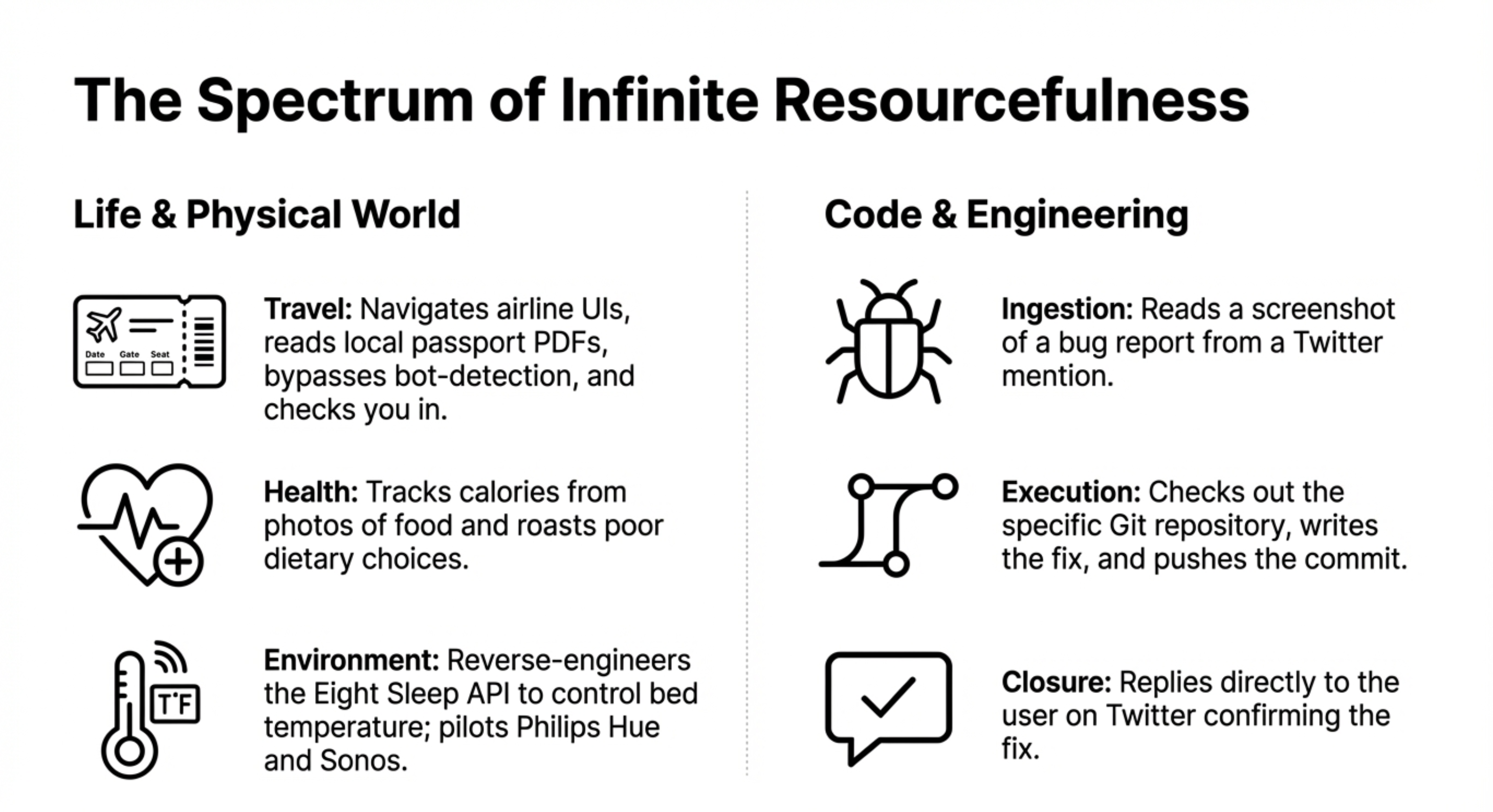 - 自主解决问题:Peter 演示了一个震撼案例:他将一张包含 Bug 的推文截图发给 AI,助手自动拉取 Git 仓库、分析代码、修复漏洞、提交代码,最后还回复了推文。当遇到未知格式时,它会自己搜索工具(如 ffmpeg)并完成转换。