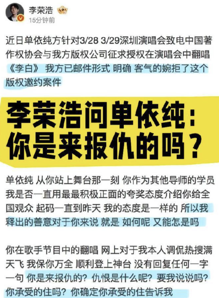 单依纯演唱会未经授权翻唱《李白》!李荣浩发出核心四连问,吴向飞掺和进来后果如何