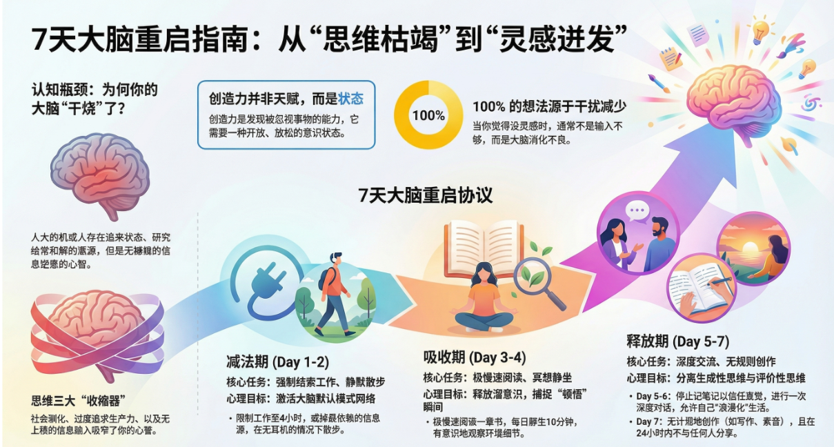这篇文章探讨了在现代社会中,创造力作为一种稀缺资源如何被过度刺激和过度产出所掩埋。作者指出,心理负担、盲目追求生产力以及信息过载是导致思维枯竭的主要因素,而解决之道在于通过真正的枯燥来重置大脑。文中提出了一套为期七天的大脑重置协议,核心在于减少外部摄入、练习深度察觉,并学会在没有任何压力的情况下进行创作。其最终目的不仅是帮人找回产生新见解的能力,更强调了拥有一个具有个人意义的项目作为思维锚点,能让大脑自发地将现实碎片转化为灵感火花。