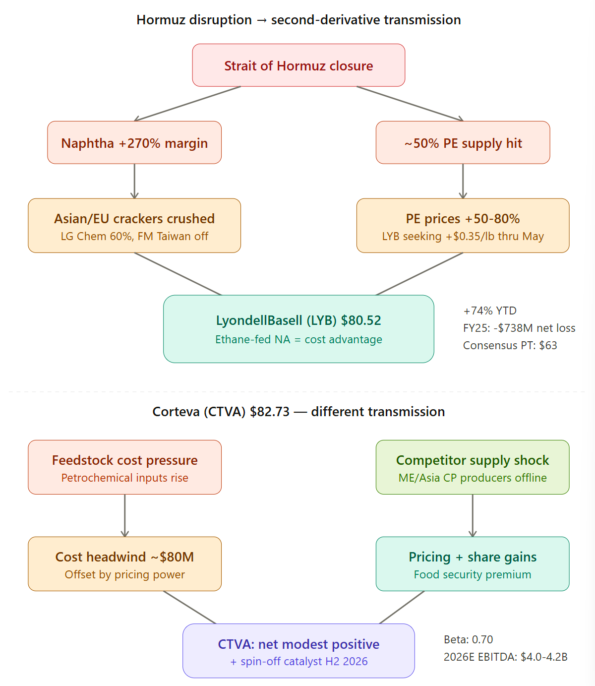 霍尔木兹海峡关闭严重扰乱了全球聚乙烯供应,导致LyondellBasell (LYB) 等生物公司股价飙升74%并已充分定价。Corteva (CTVA) 则代表了市场尚未充分认识到的二阶投资机会,其受益机制间接且滞后。因此,建议采取做多CTVA/做空LYB的相对价值配对交易,以捕捉这一被低估的机遇。