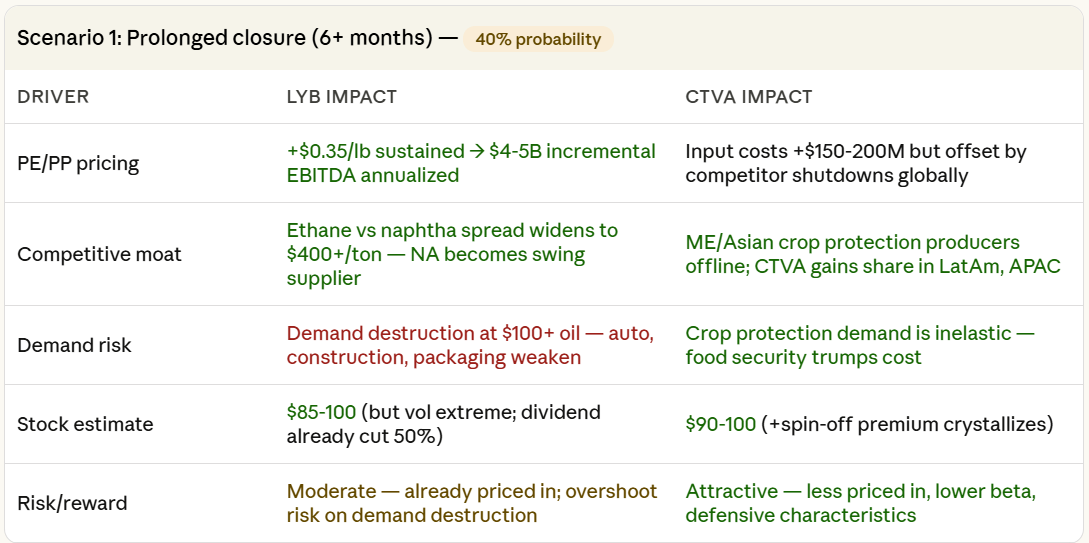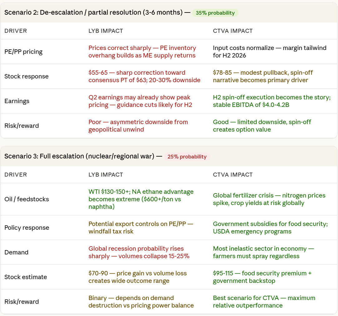 - 情景分析: 通过评估了霍尔木兹海峡“延长关闭”(40%概率)、“降级/部分解决”(35%概率)和“全面升级”(25%概率)三种情景,结果显示CTVA在多种情景下(尤其降级和全面升级)相对于LYB具有更强的抗风险能力和潜在回报。