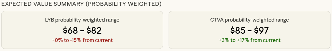 - 概率加权预期: 在此情景矩阵下,LYB的概率加权股价范围为68-82美元(当前可能下跌0%至15%),而CTVA为85-97美元(当前可能上涨3%至17%)。
