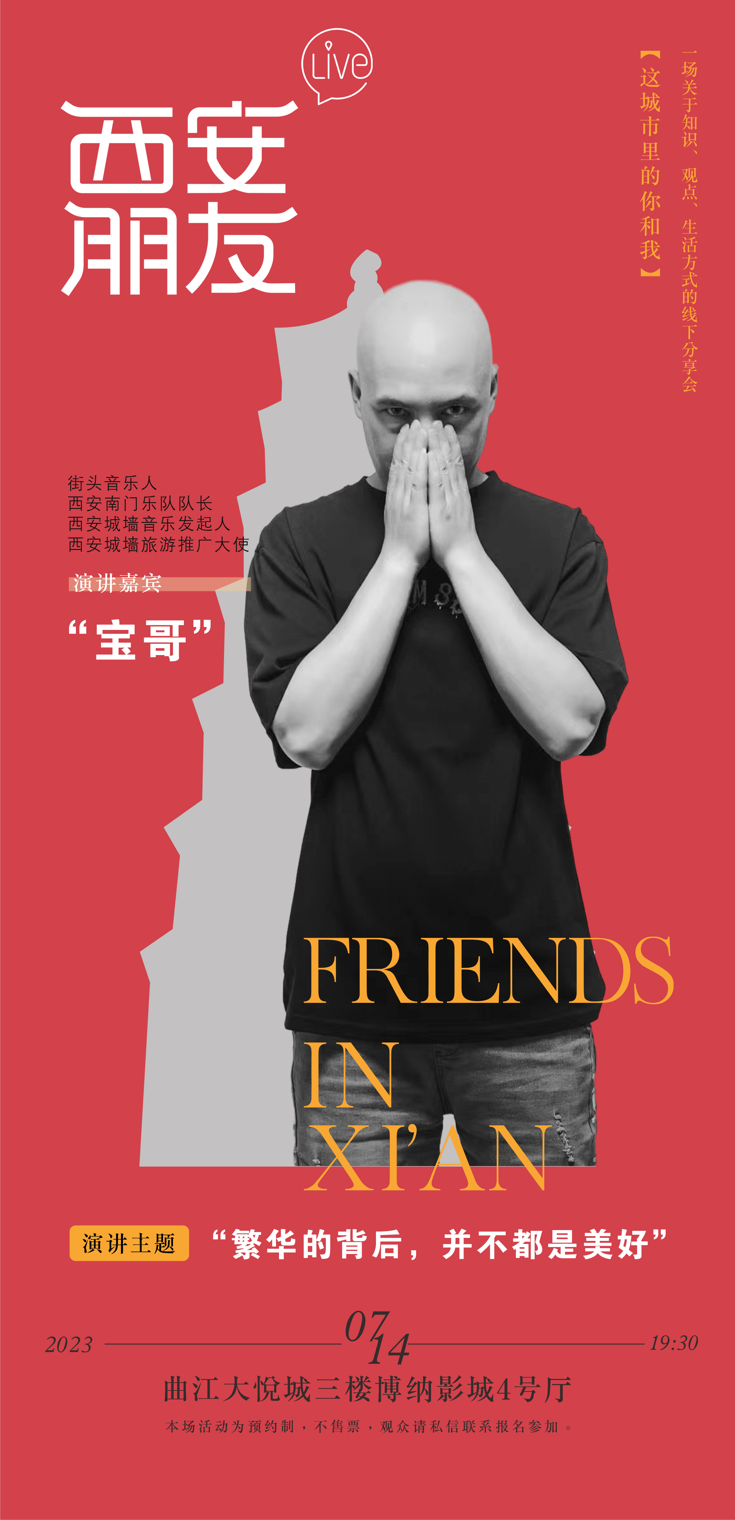 [西安朋友live]大会,以“知识、观点、生活方式”为主题,每月召集西安各个领域的嘉宾,以演讲的形式,分享他们关于城市、社会、艺术、人文的思考和探索。