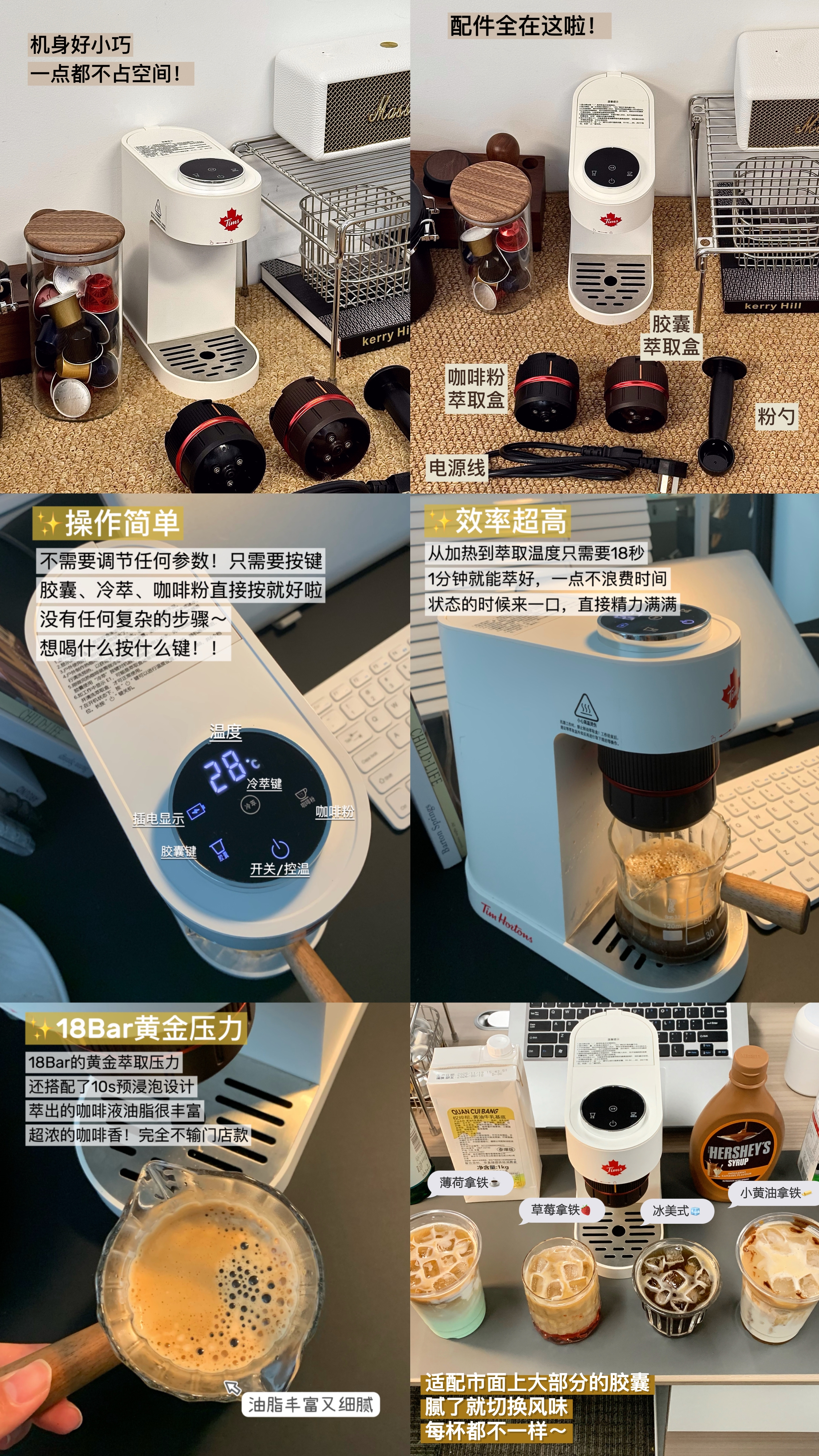 强烈推荐Tims这款咖啡机,支持胶囊咖啡 / 意式咖啡 / 美式咖啡三种模式,油脂很丰富,18秒加热、1分钟出杯,早上赶时间也能快速做一杯咖啡。还支持常温萃取冷咖啡,做冰美式、冰拿铁或者各种创意咖啡都很方便。占地只有A4纸大小且自重很轻,下单就送门店同款胶囊咖啡,同时兼容大品牌胶囊咖啡机,很方便。