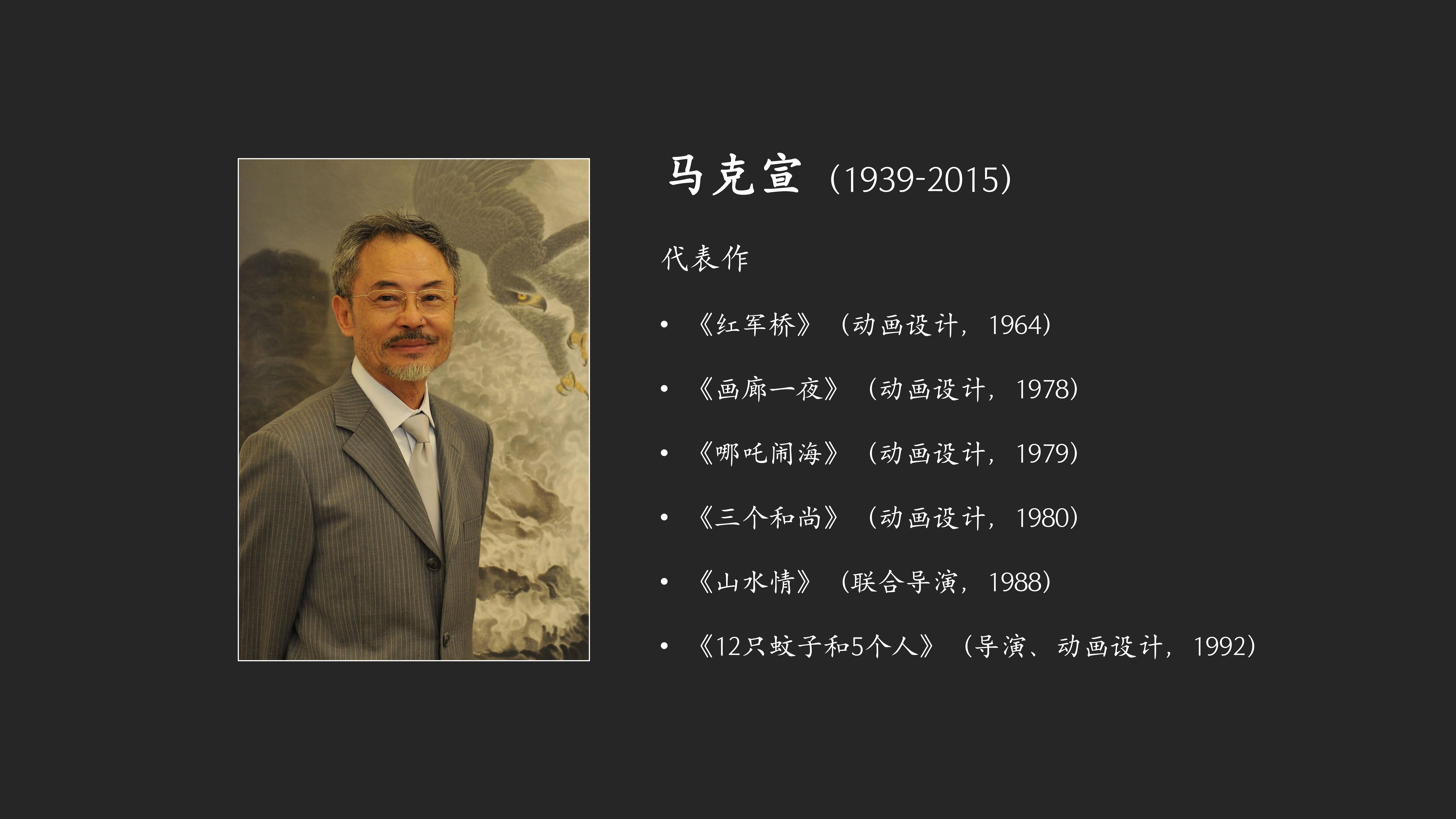 马克宣(1939-2015)。1959年毕业于浙江美术学院附中,同年进入上海美术电影制片厂工作,先后担任动画设计、美术设计、导演。曾参与《红军桥》《金色的大雁》《画廊一夜》《哪吒闹海》《我的朋友小海豚》《三个和尚》等影片的角色动作设计,以及《善良的夏吾冬》《天书奇谭》的美术设计工作。联合导演作品有《超级肥皂》《新装的门铃》《山水情》,独立导演作品有《大扫除》《12只蚊子和5个人》。后任职于多家动画企业,晚年在吉林艺术学院、北京大学等院校任教。