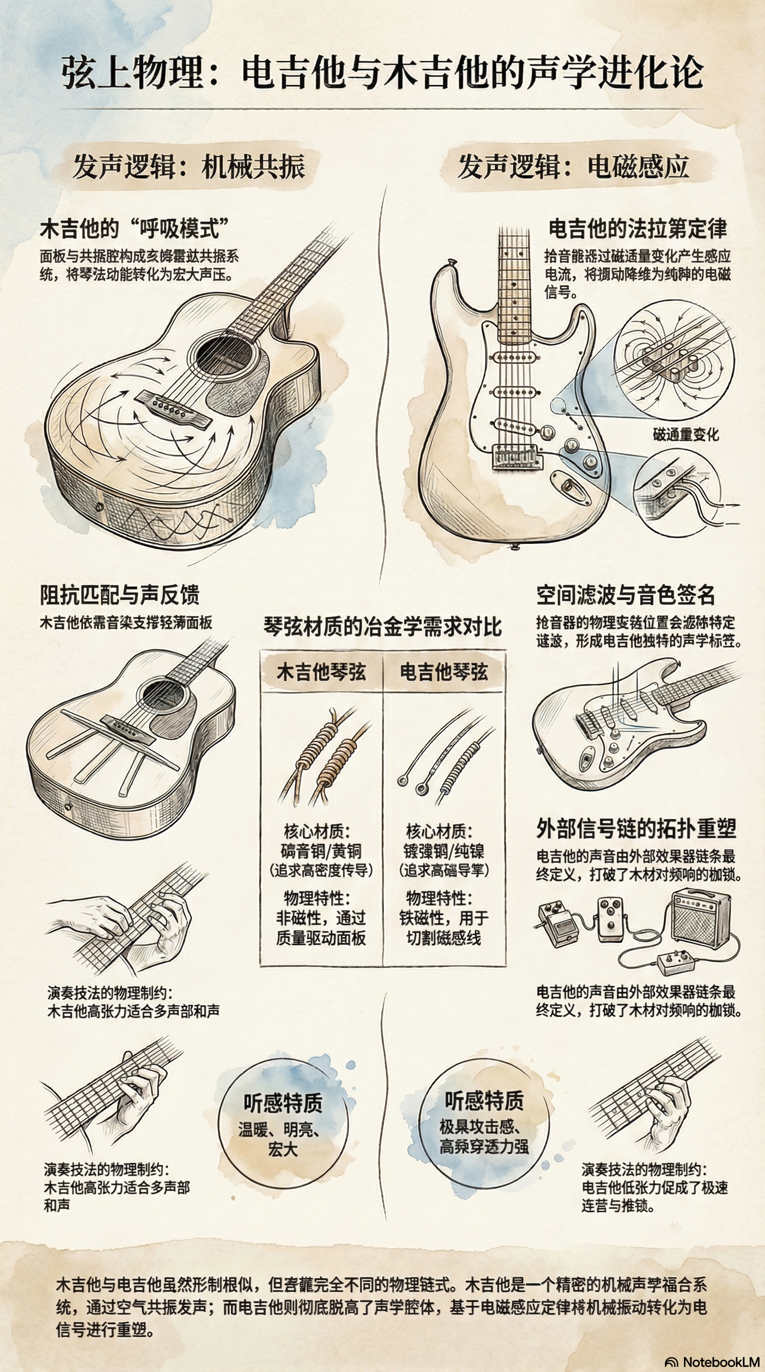 这份文献从物理学与声学的多维视角,系统地剖析了电吉他与木吉他在发声机制及结构设计上的根本差异。文中详尽解释了木吉他如何通过机械共振与流体力学将琴弦动能转化为声能,并对比了电吉他利用电磁感应原理实现信号转换与电子重塑的过程。作者深入探讨了拾音器原理、RC滤波电路以及信号链拓扑等电声技术,同时也研究了木材属性、冶金工艺及人体工程学对两种乐器演奏技法的深远影响。通过严谨的科学论证,该资料展示了传统声学工程与现代电子工程在吉他演化史中的交汇与分化。全篇旨在为音乐人与工程技术人员提供一个理解乐器物理本质的深度理论框架。