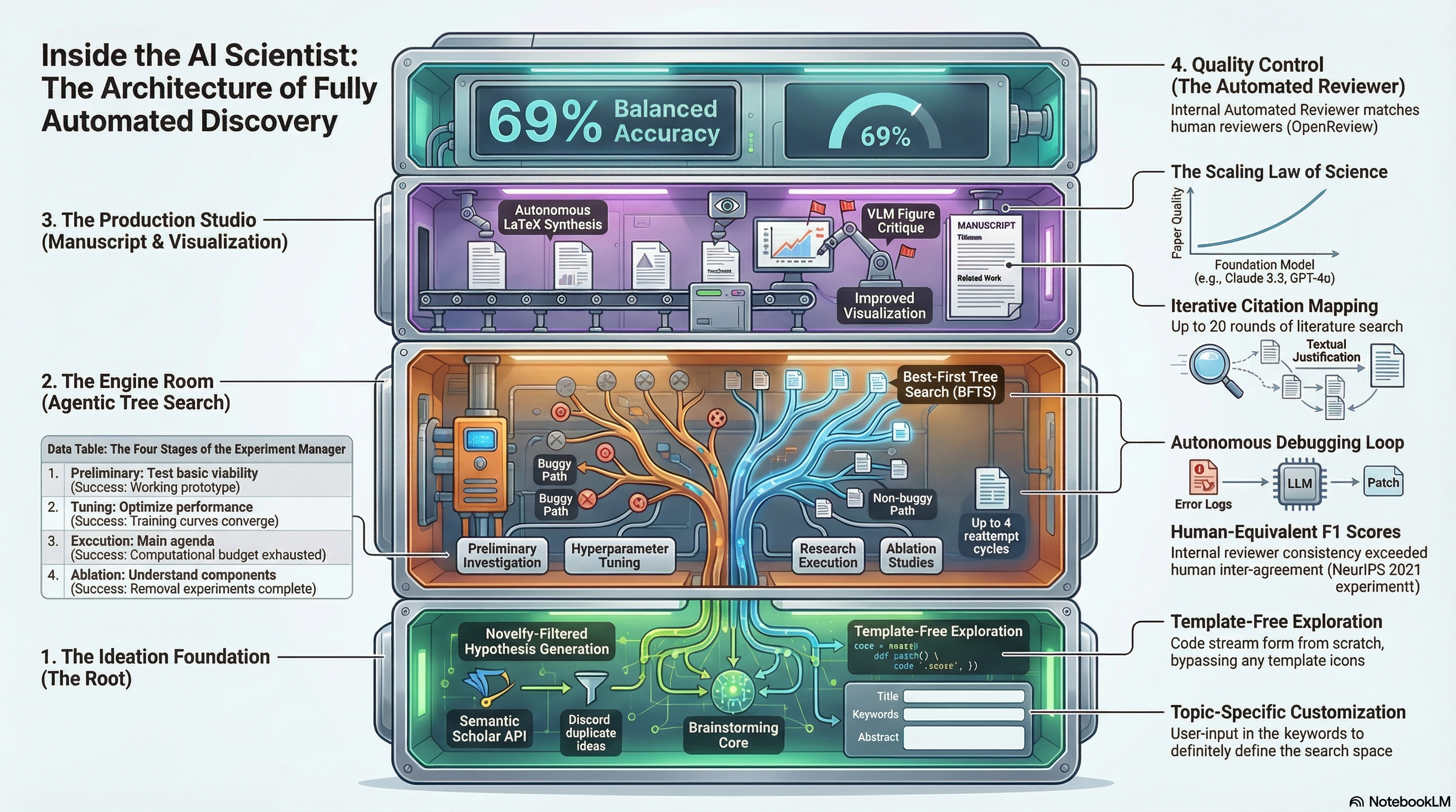 这些来源详细介绍了一个名为 The AI Scientist 的全自动科学研究系统,该系统由 Sakana AI 及其合作机构开发。该项目利用底层基础模型,能够自主完成从生成假设、编写代码、运行实验到撰写完整科学论文的全流程。其升级版本 v2 引入了智能代理树搜索技术,摆脱了对固定模板的依赖,实现了更具探索性的科学发现。值得注意的是,该系统生成的论文已成功通过了顶级 AI 会议工作坊的人类同行评审。此外,研究团队还开发了自动化评审系统,其评估准确度已达到与人类专家相当的水平。尽管目前仍存在幻觉和逻辑严密性等局限,但这一进展预示着人工智能驱动的自动化科研范式正在开启。