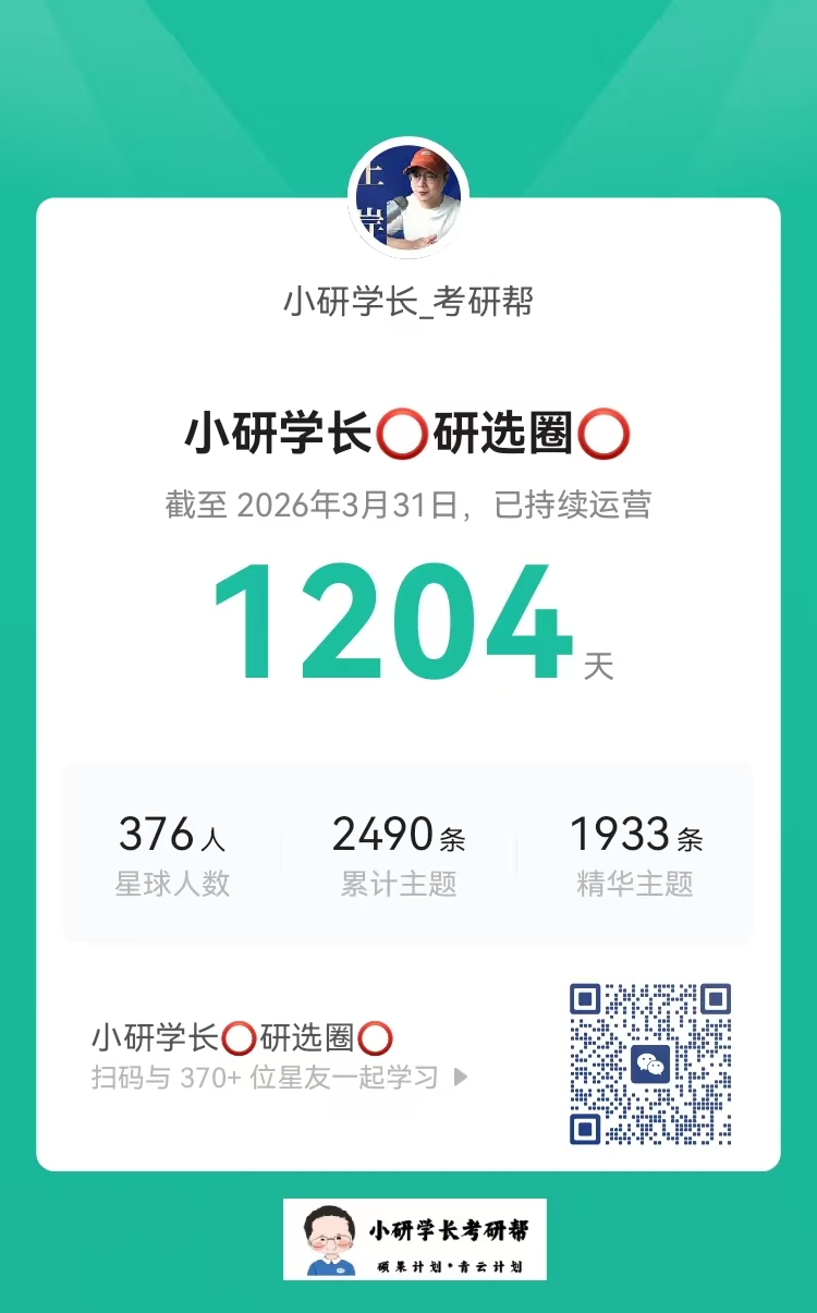 —我是小研学长,12年硕士升学规划教练每年指导100位92名校考研/保研/读研的同学我创建一个研选圈,已运营1204天每日更新5-10条保研/考研/读研朋友圈。加我好友:757066169,成就一流大学生。(备注:小宇宙)