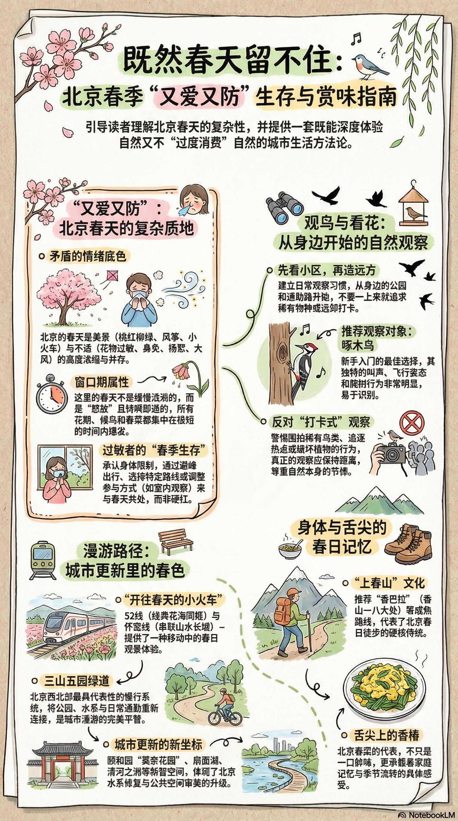 我们从一句“又爱又防”出发,重新聊了一遍北京春天的复杂质地:它一边是白玉兰、山桃、樱花、春山、风筝、小火车和短暂怒放的城市景色,一边又是花粉过敏、鼻炎、杨絮、风大和稍不留神就错过的季节窗口。明扬从城市漫游、绿道、水系和山路讲北京春天的空间经验,于方从观鸟、植物和自然观察讲北京春天的生态层次;两条线索交织在一起,最后落到一个很实际也很重要的问题上:我们到底该怎么在这座城市里,既不辜负春天,也不过度消费春天。