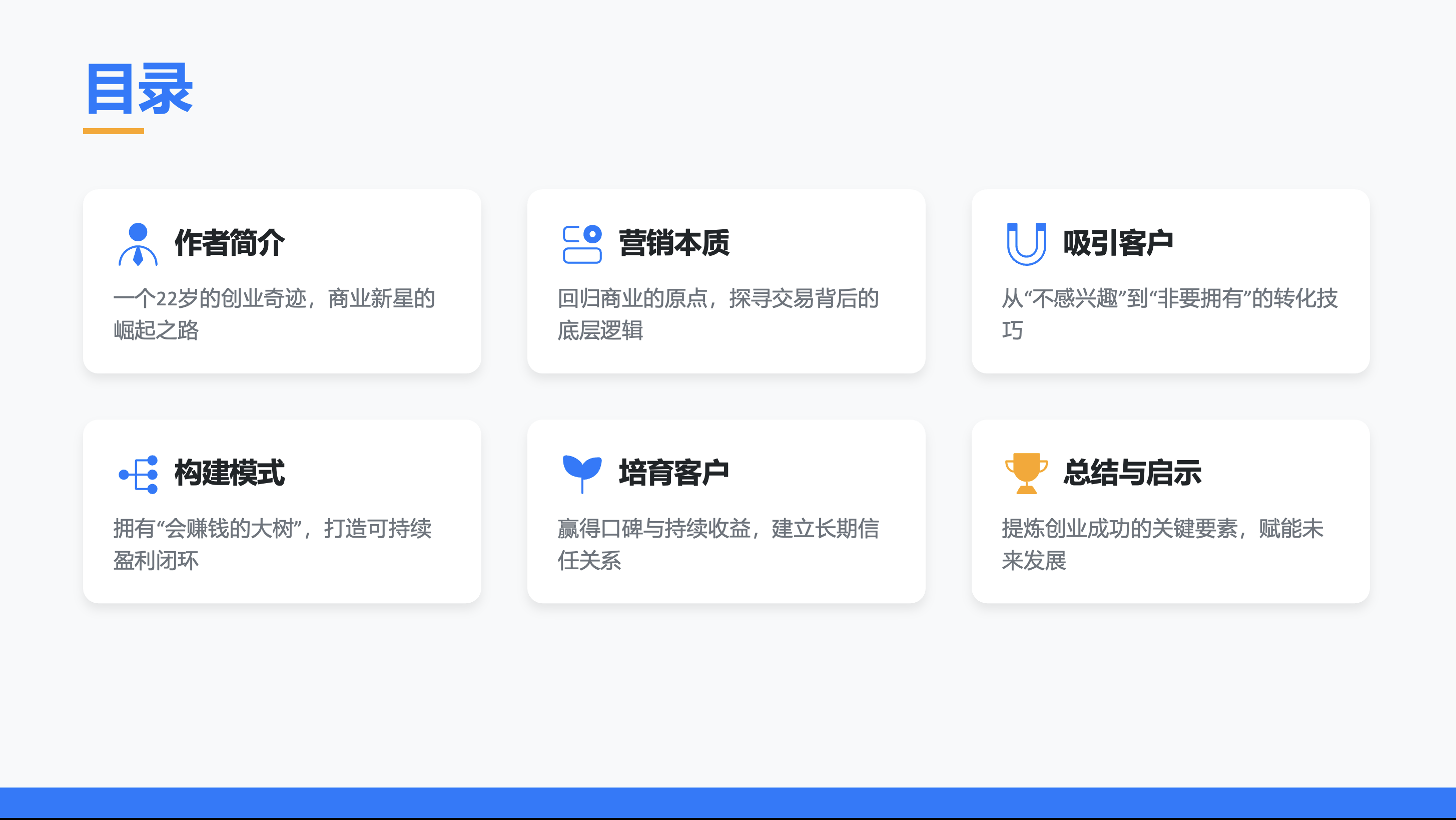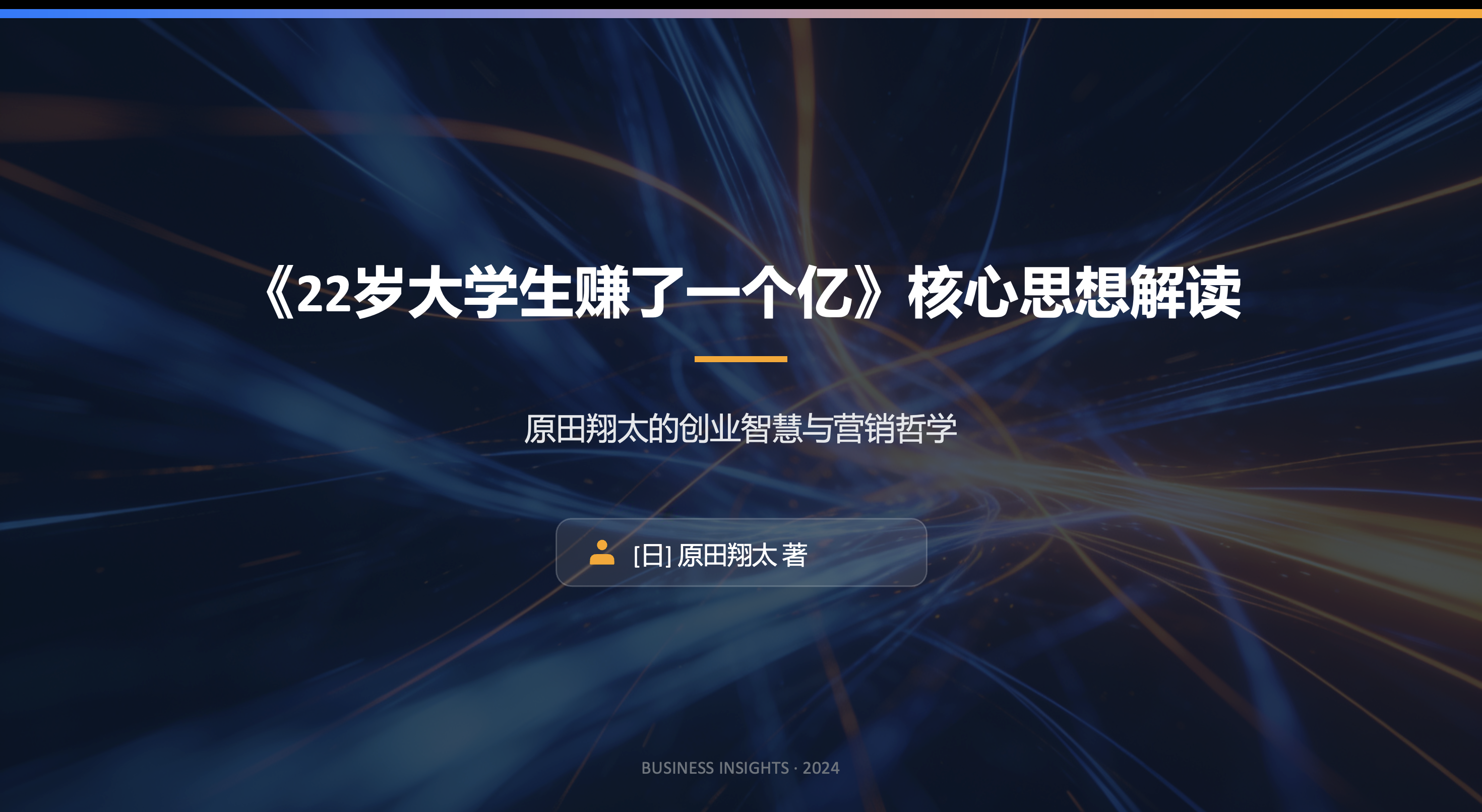 大家好,今天我将为大家解读一本非常有意思的书——《22岁大学生赚了一个亿》。这本书的作者是日本的原田翔太,他在非常年轻的时候就取得了令人瞩目的商业成就。接下来,我们将一起探讨他的创业智慧和营销哲学,看看能给我们带来哪些启发。本次分享将分为六个部分。首先,我们会了解作者原田翔太的传奇经历;接着,深入探讨他所揭示的营销本质;然后,学习如何吸引客户、构建盈利模式以及培育忠实客户;最后,进行总结并分享其中的启示。