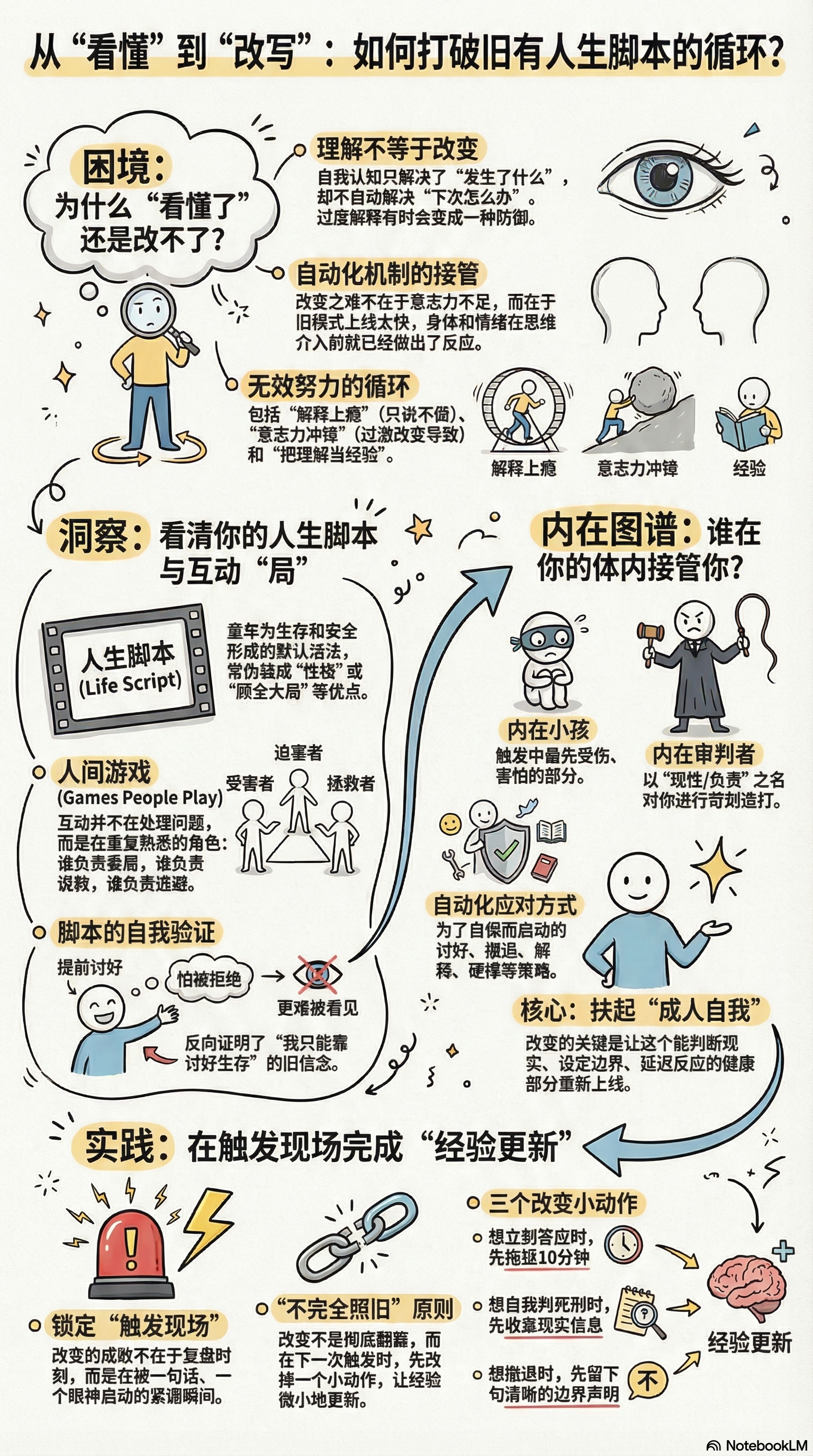 很多时候,问题不是你不够了解自己,而是你把“看懂自己”误当成了“已经开始改变”。我们越来越会解释自己的讨好、退让、沉默与自责,却还是会在真正被触发的现场,照旧被旧模式接管。这一期想讨论的,正是认知与改变之间那座最容易被忽略的桥:改变不只发生在思维里,更要发生在经验里、反应里,以及一次次不完全照旧的小动作里。