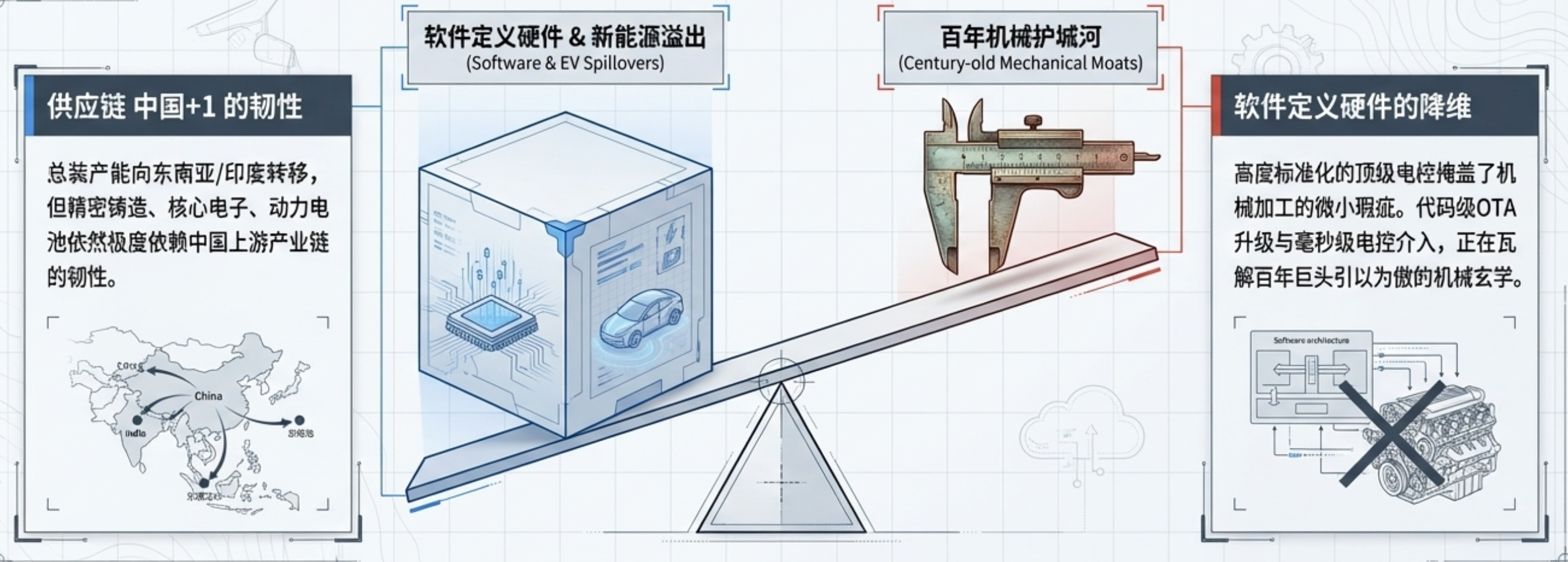 软件定义硬件的电控降维打击: 中国车企通过高度标准化的顶级电控单元(如博世六轴IMU)与自主标定的底层算法,实现了毫秒级的弯道ABS、牵引力控制介入。这种“软件魔法”极大弥补了机械加工层面的微小瑕疵,打破了传统的“机械玄学”壁垒。