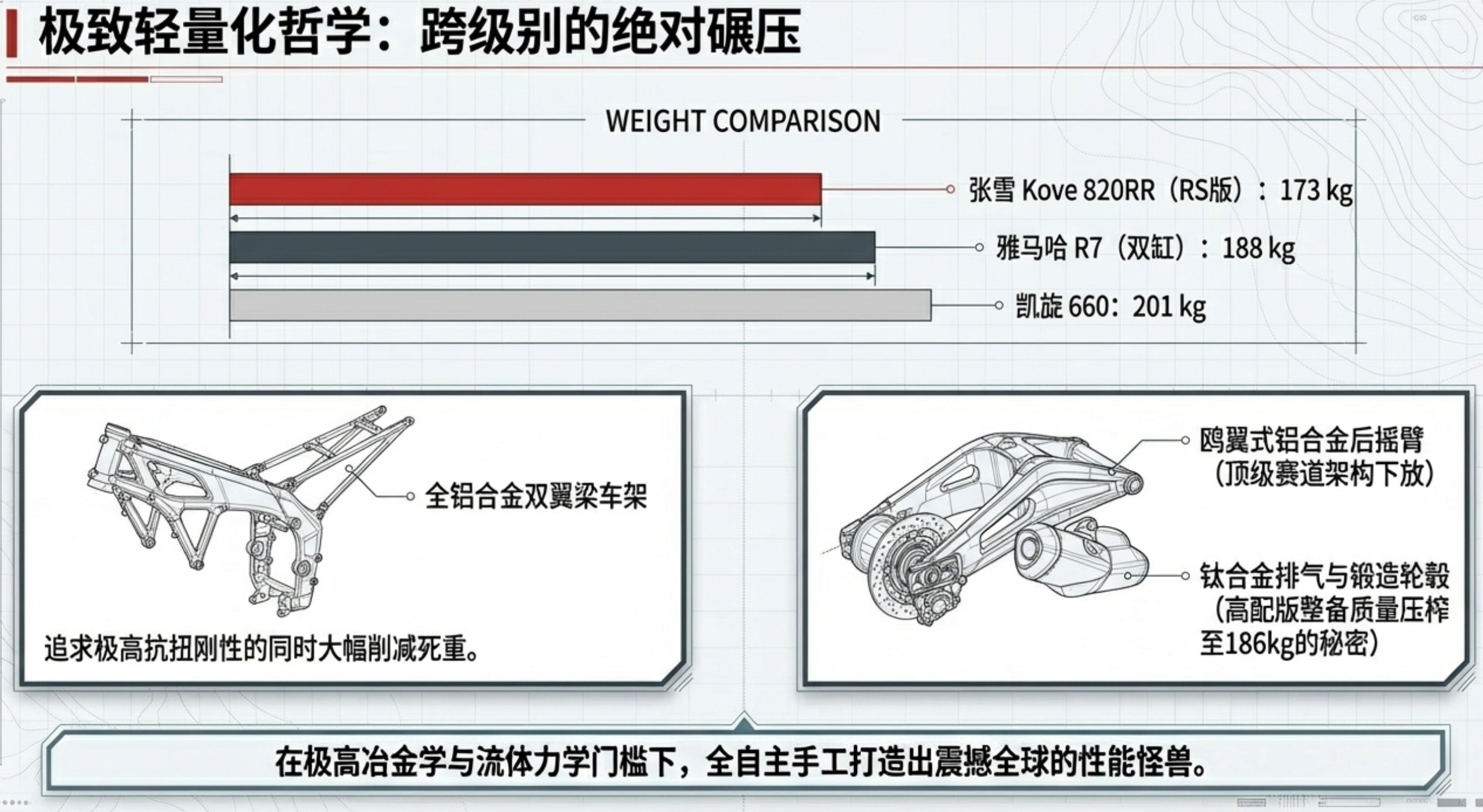 极致的轻量化工程: 采用全铝合金双翼梁车架与高真空一体压铸技术,大幅削减死重。例如张雪820RR赛车版仅重173kg,450RR比同级川崎轻了整整23公斤,在推重比上实现弯道超车