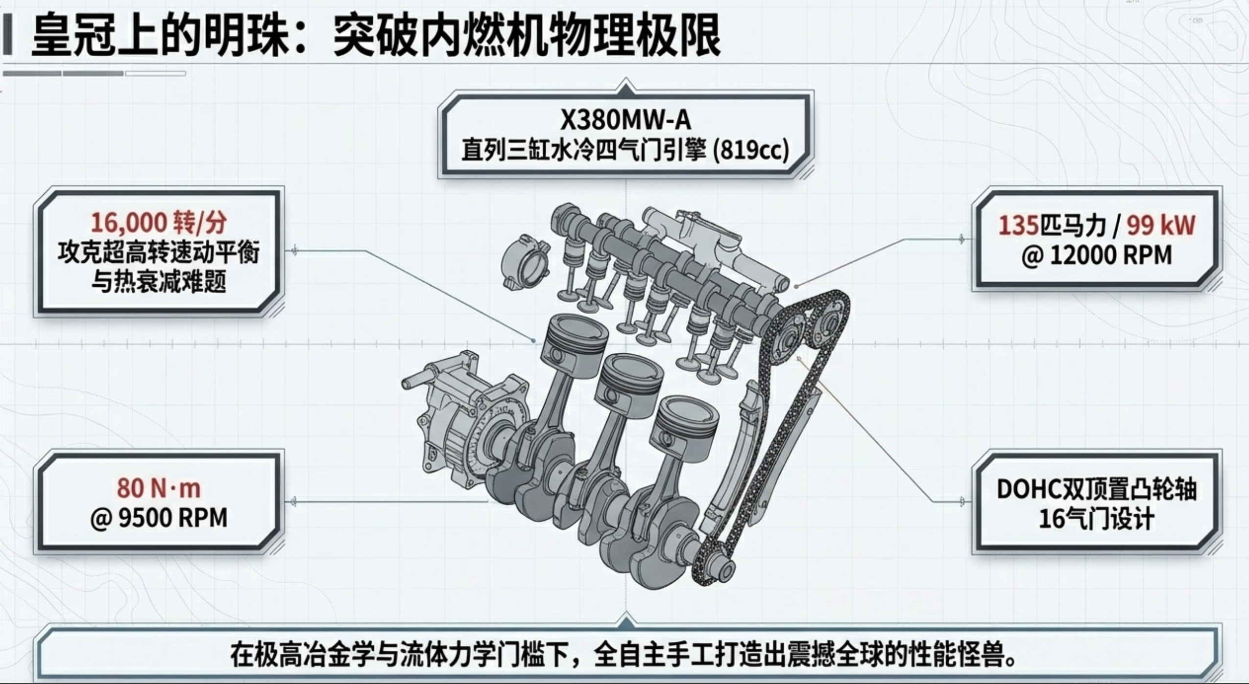 1. 尖端材料与高端成型工艺的低成本化新能源汽车产业的发展催生了极其庞大且先进的工业基础设施。摩托车制造企业借此能够以极其低廉的边际成本,获取到以往只有航空航天或顶级赛车才会使用的钛合金成型、镁合金铸造等高端工艺。例如,张雪机车正是利用这种红利,为其高转速引擎配备了高强度的镁合金活塞与钛合金连杆,从而成功打造出能突破16000转的三缸性能怪兽。