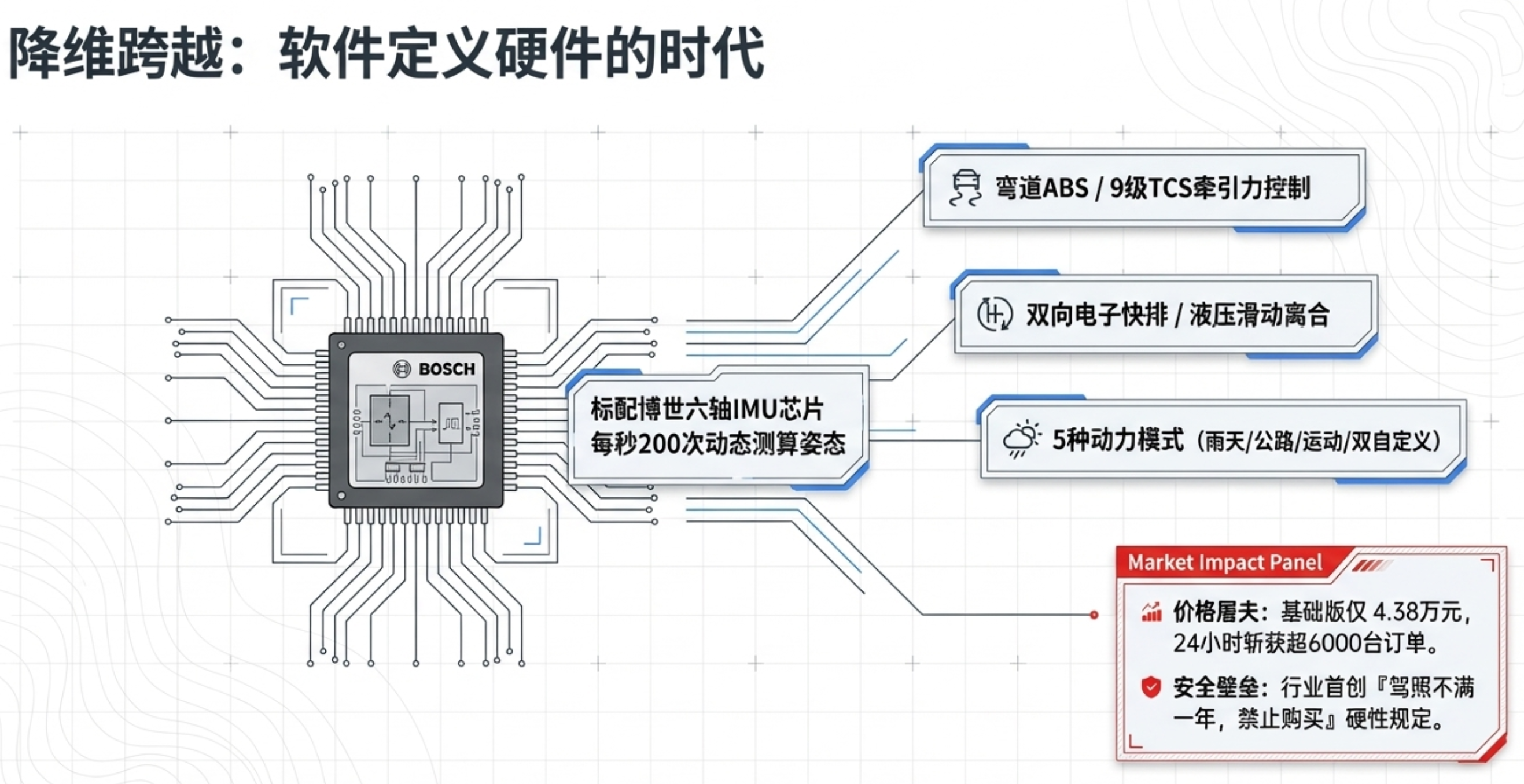 1. 引入顶级标准硬件配合国产高性能芯片张雪机车摒弃了传统欧美日品牌在“机械制造微小公差”和“齿轮啮合阻尼感”上死磕的“机械玄学”,转而直接采购高度标准化的顶级电控单元。例如,其820RR车型全系标配了博世(Bosch)六轴IMU(惯性测量单元),该硬件能够以每秒200次的极高频率动态测算车身姿态。配合国产高性能芯片,为复杂的软件算法提供了强大的算力基础