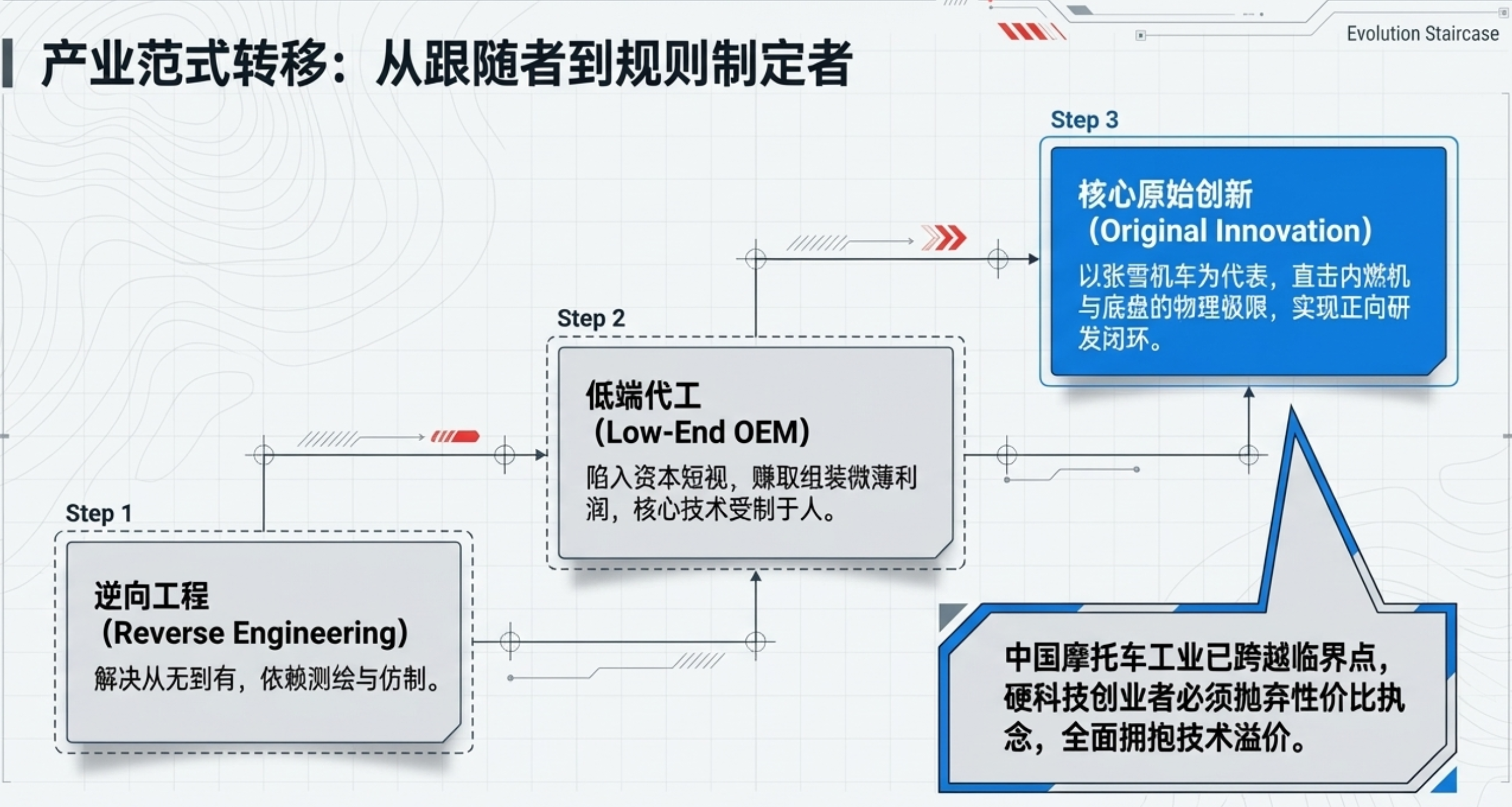 这些资料详细分析了张雪机车如何通过自主研发的三缸发动机技术,打破欧美日品牌长期垄断的全球高端摩托车市场格局。文章指出,中国品牌凭借重庆与江门的高效供应链协同,实现了比传统巨头更快的敏捷研发与技术迭代速度。与此同时,传统品牌正面临各自的困境:日本品牌深陷官僚体制与创新迟缓,欧洲品牌受困于财务危机与供应链外包,而美国品牌则困于受众老龄化。报告强调,中国在新能源汽车领域的技术积累已产生溢出效应,助力燃油机性能实现物理极限的突破。通过赛道夺冠与高性价比的产品定义,中国摩托车工业正从低端代工向核心原始创新进行范式转移。这一进程标志着全球行业竞争已从单纯的机械比拼,演变为涵盖软件算法与制造效率的全面对抗。
