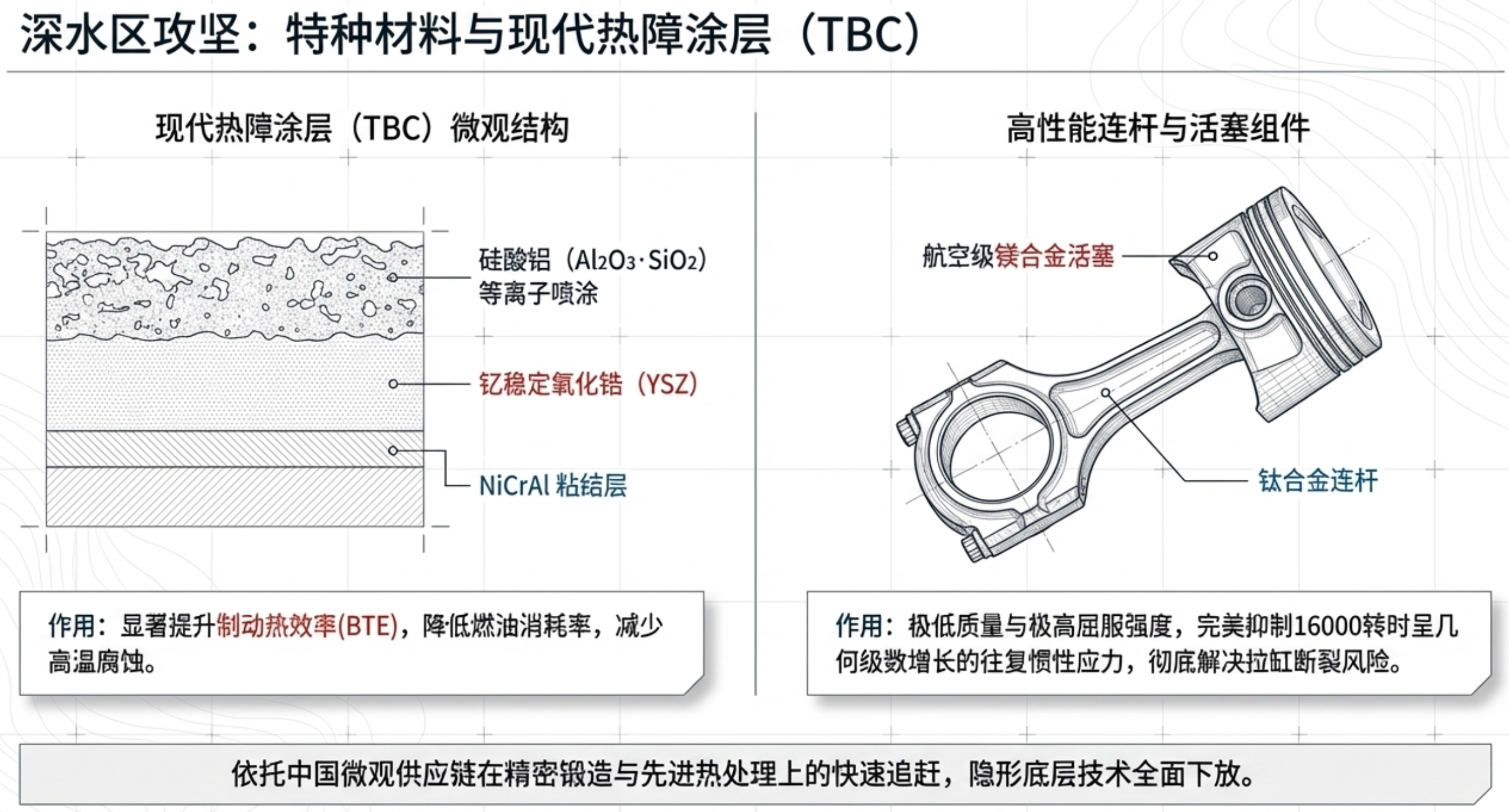 - 核心优势:材料科学与新能源产业溢出效应: 中国摩托车正利用新能源汽车庞大的先进制造基础设施(如高精度数控机床、一体化压铸)对内燃机进行降维打击。在发动机技术深水区,中国品牌能以低成本应用钛合金连杆、镁合金活塞,以及钇稳定氧化锆(YSZ)热障涂层等尖端冶金与热处理技术,成功突破16000转超高转速下的动平衡与热衰减难题