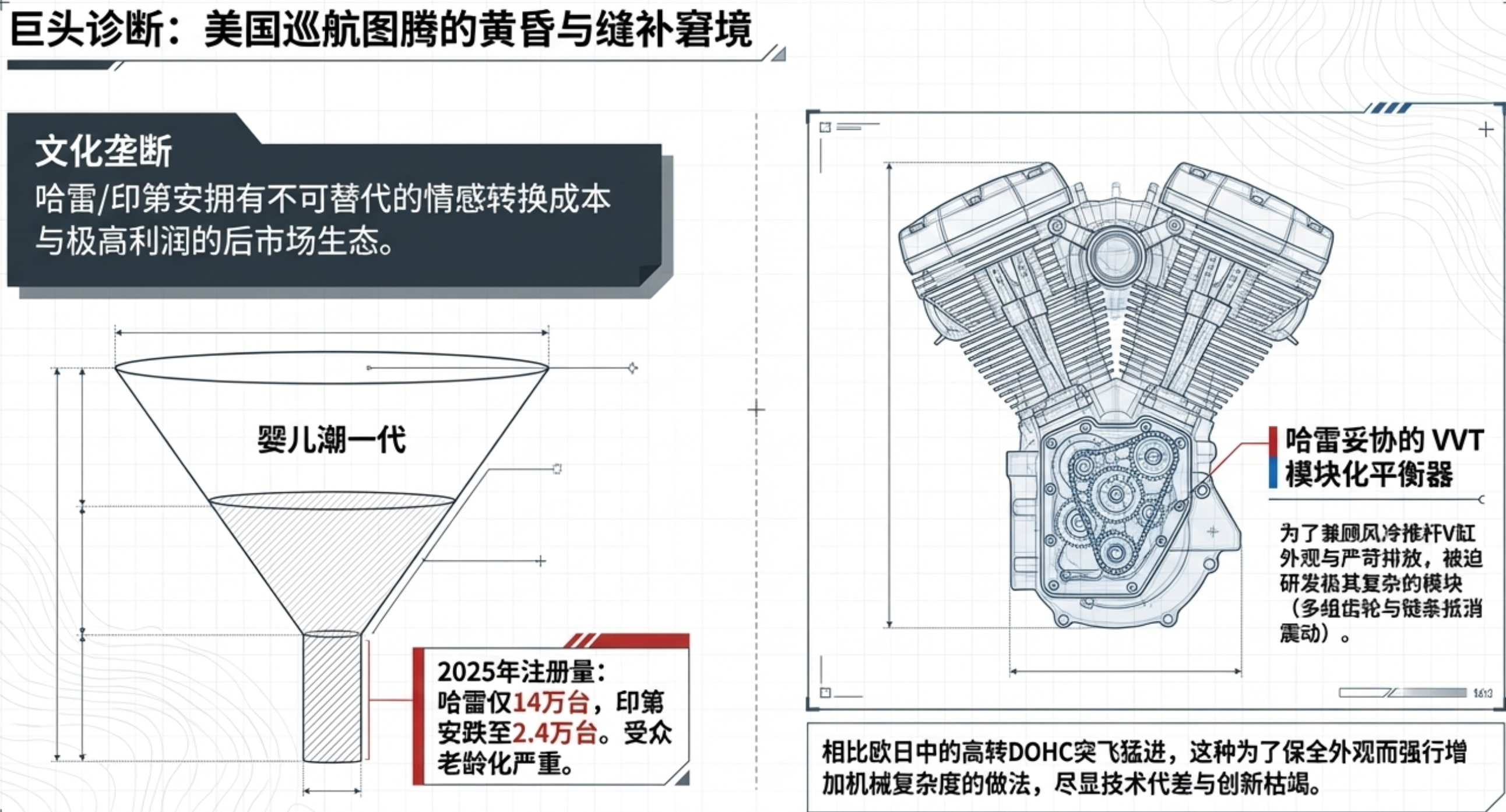 - 核心劣势:技术创新陷入“缝补”窘境: 受制于复古原教旨主义的审美束缚,为了保全风冷推杆V型双缸的外观,只能增加复杂的机械平衡器或外挂可变气门正时(VVT)模块来勉强降低震动和满足环保,与欧日中大力发展的高转速DOHC多缸机存在明显的技术代差。