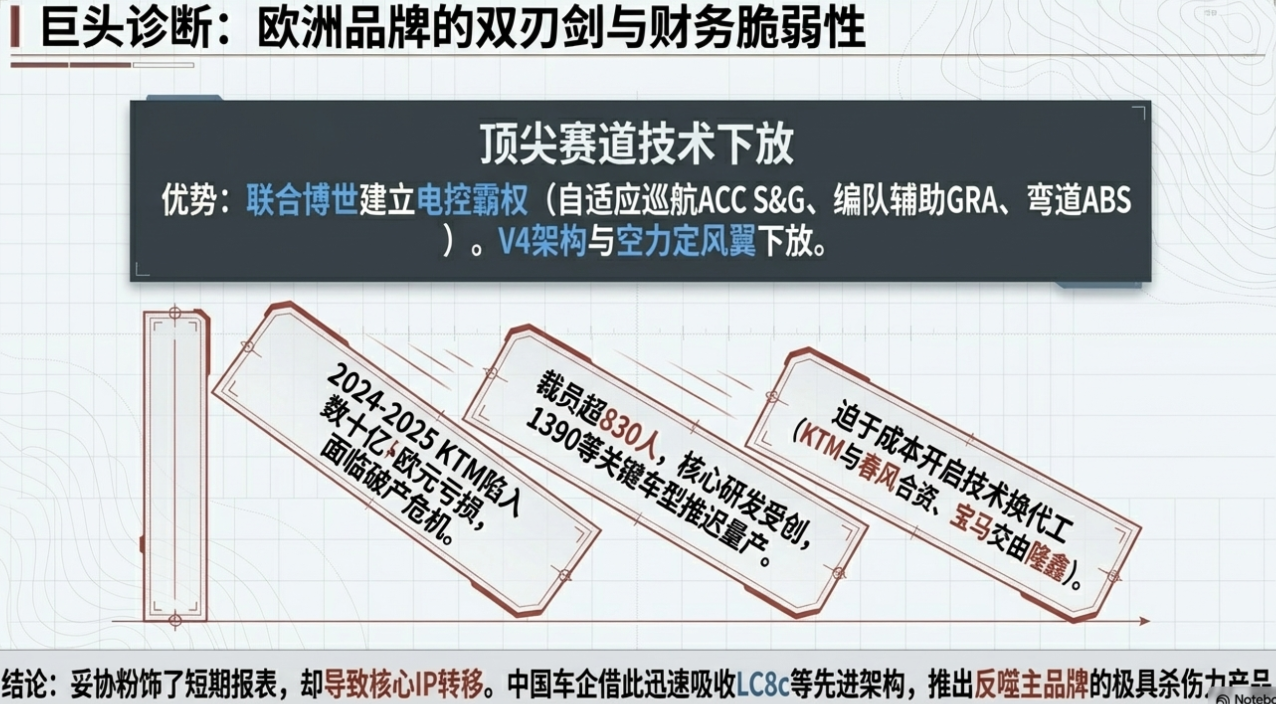 智能电子控制系统的绝对霸权: 与博世等顶级供应商建立生态同盟,率先普及带有前置雷达的自适应巡航(ACC S&G)、摩托车稳定控制(MSC)等高级驾驶辅助系统,在主动安全领域处于统治地位 - 核心劣势:财务结构脆弱与核心技术外溢: 受制于高昂制造与能源成本,欧洲大厂频陷财务危机(如KTM濒临破产)。为了求生被迫采用“品牌下沉”策略,将中低排量发动机甚至生产线深度外包给中国车企,这实质上促成了核心知识产权向中国的转移,导致被中国车企利用先进设计规范进行反噬