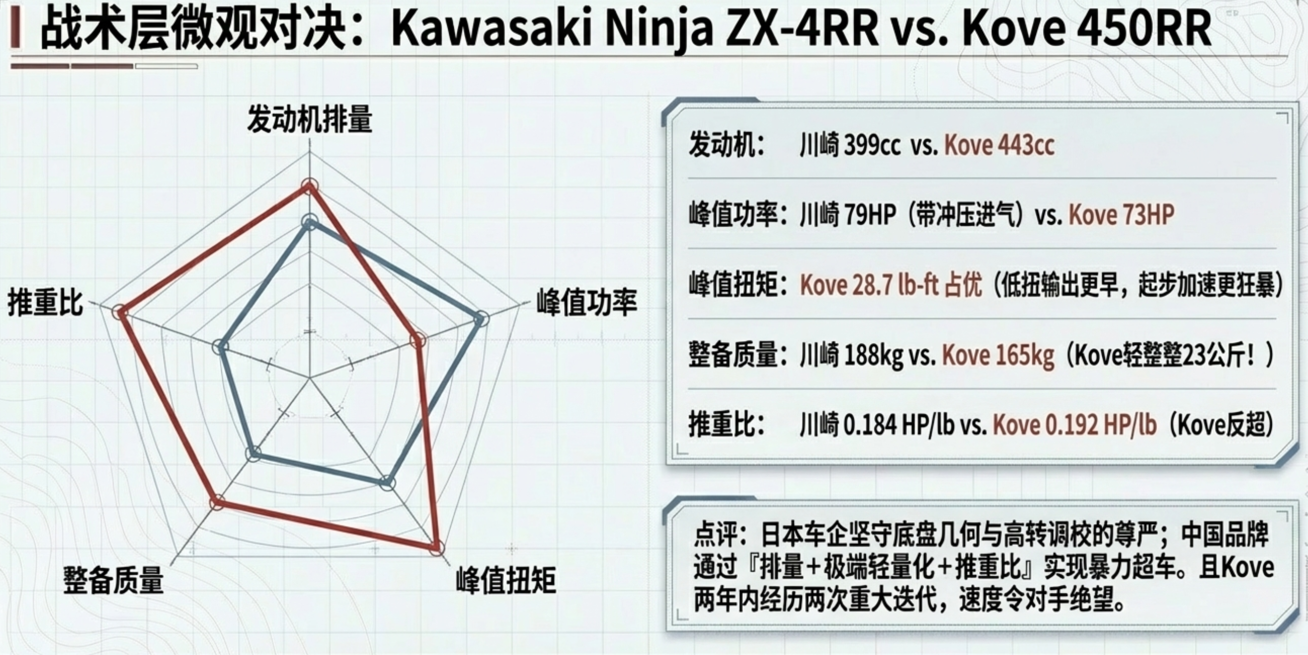 - 核心劣势:尽管在排量和轻量化上占优,但在同等基础排量的极致内燃机马力压榨、高转速冲压进气(RAM Air)的动力延展性,以及核心减震技术(如缺乏类似Showa的技术底蕴)和底盘几何的极致操控调校上,相较于日本顶尖大厂仍有细微的工程差距。