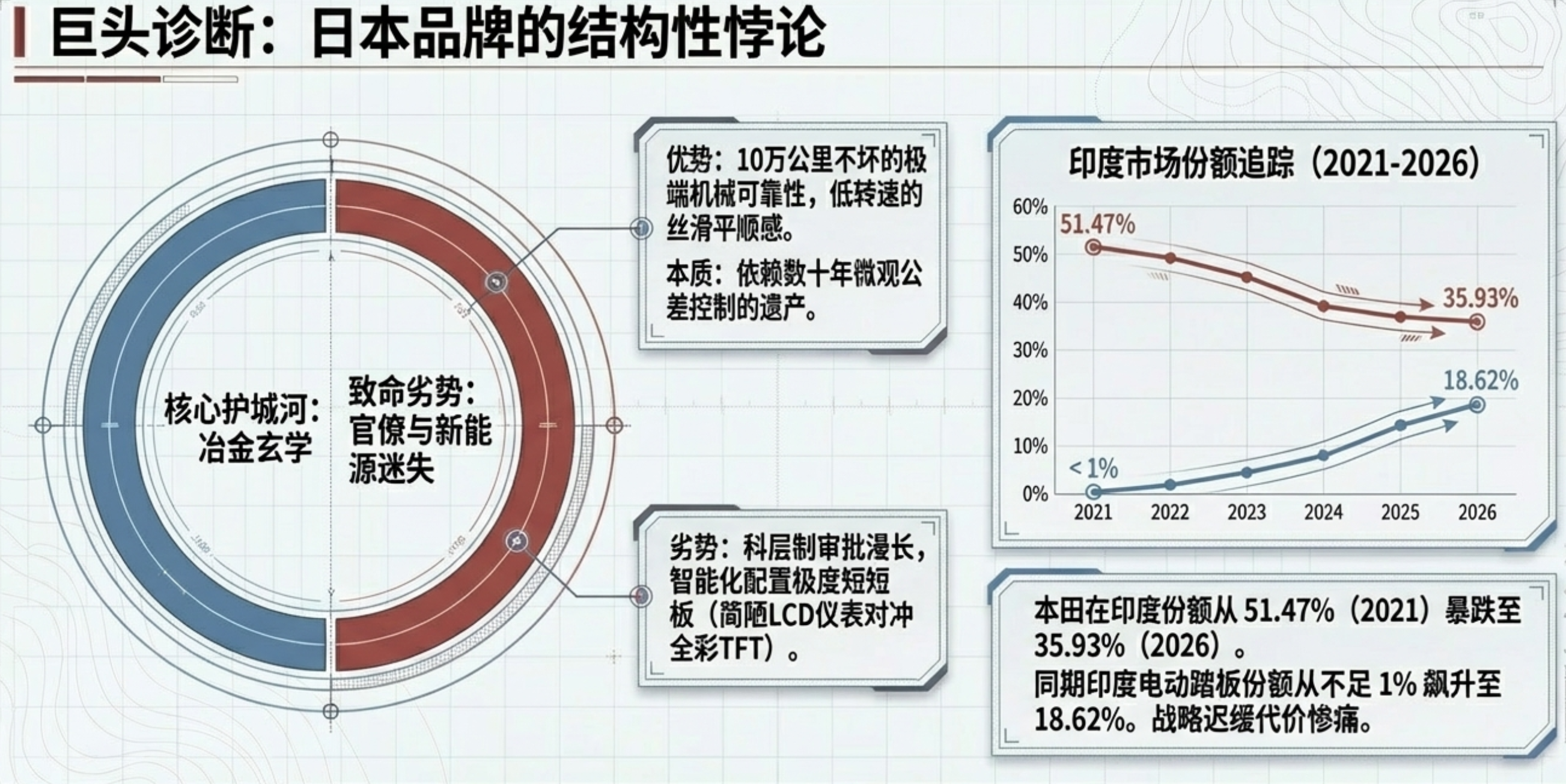 无可挑剔的机械平顺性: 在电喷燃油映射(Fuel Injection Mapping)和节气门响应调校上投入海量资源,使得低转速和拥堵路况下的动力输出如丝般顺滑,具备极高的“人车合一”可预测素质。 - 核心劣势:决策链漫长与产品迭代滞后: 遵循传统“改善”理念的科层制审批使得研发周期长达三到五年,难以应对中国品牌一年多次的技术迭代攻势