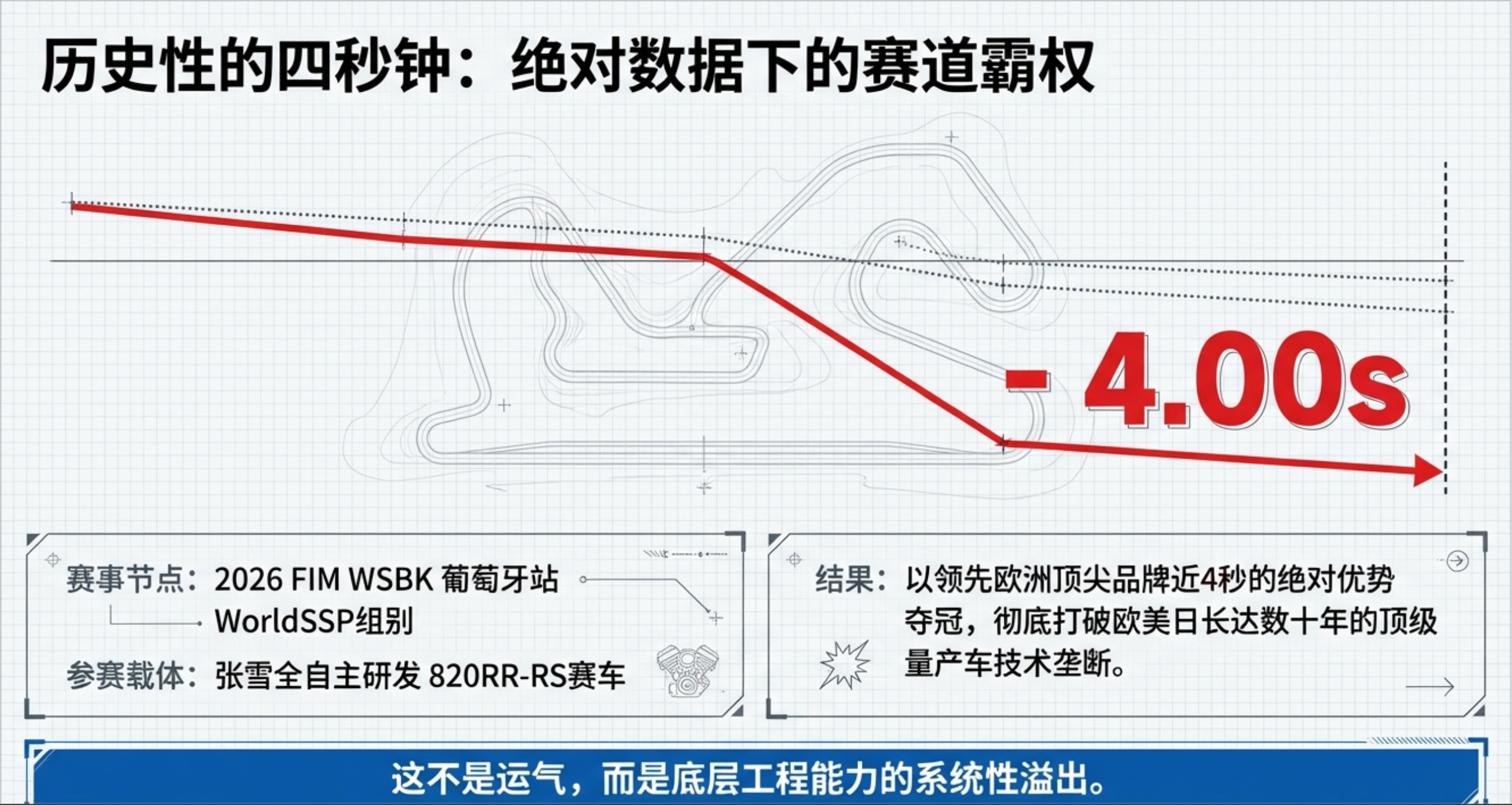 1. 将“赛道作为最高级实验室”的极限迭代速度传统日本和欧洲大型车企研发一款全新发动机通常需要三到五年的漫长周期,且要在成本、营销与技术间不断妥协。而张雪机车打破常规,直接将手工打造的820RR-RS赛车投入世界超级摩托车锦标赛(WSBK)赛场,在极端的高温、高压与高频震动环境下收集发动机运转数据。通过这种实战测试,研发团队在短短一个月内,就通过自主调校将赛车从澳大利亚站的第14名逆袭至葡萄牙站的冠军。此外,赛事中验证的六轴IMU电控参数、弯道ABS标定等高端技术,能够在短短六个月内迅速转化为民用量产技术,这种迭代速度是依赖繁琐审批流程的海外大厂无法企及的。