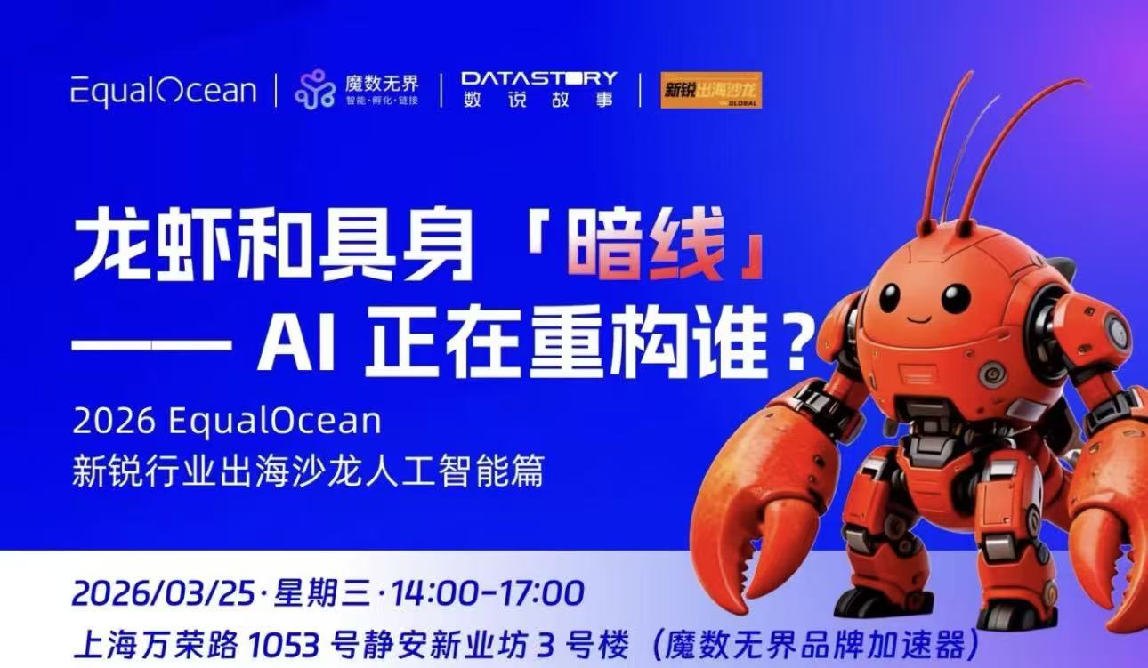 2026 年 3 月 25 日下午,由出海全球化新型智库 EqualOcean 主办、魔数无界品牌加速协办、DataStory 支持的 “新锐行业出海沙龙 —— 人工智能出海沙龙” 在上海成功举办。来自UCloud、e签宝、飞书深诺集团、大晓机器人、钛虎机器人等科技企业的创始人、负责人及行业专家进行了精彩分享,共同为 AI 出海企业提供前沿洞察,并搭建产业链接机会。